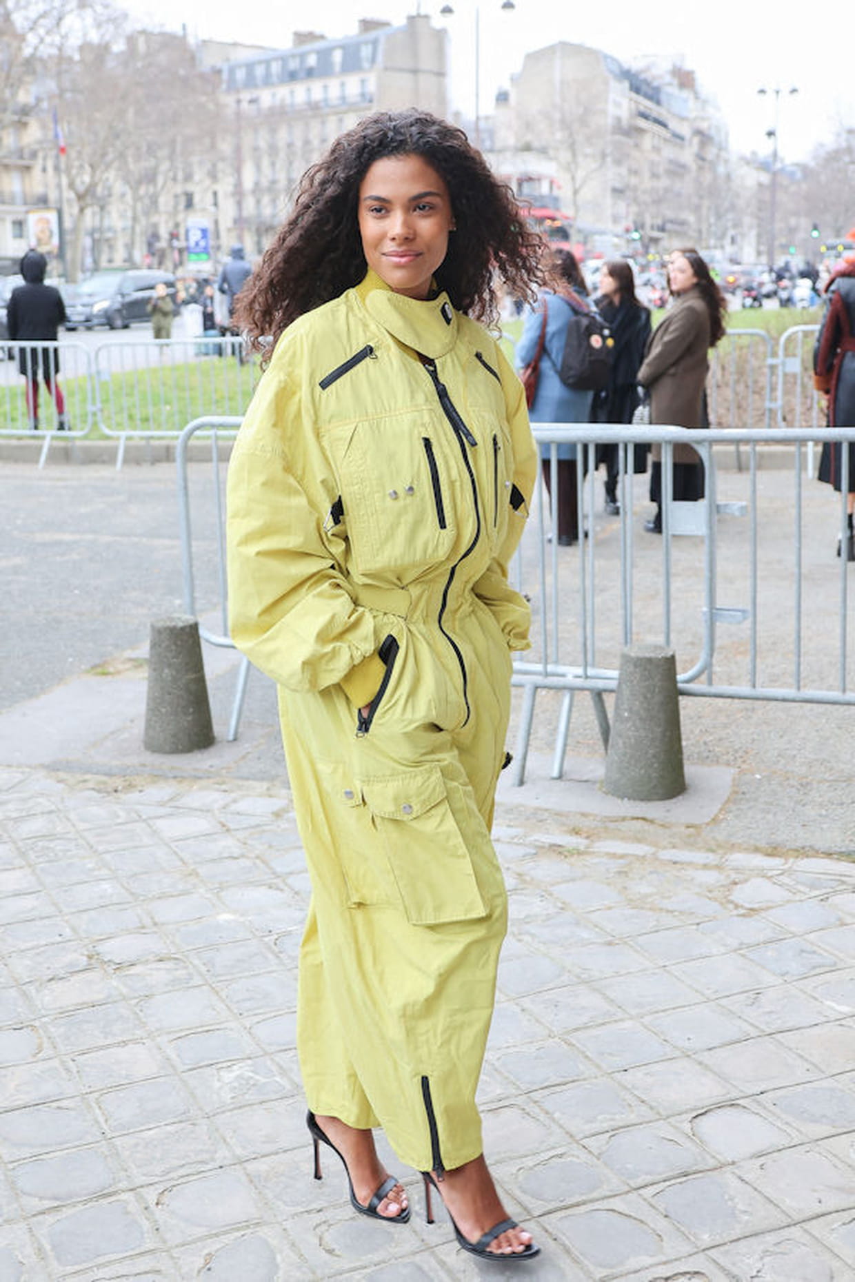Tina Kunakey en combinaison oversize jaune zippée Stella McCartney au défilé Stella McCartney pendant la fashion week automne-hiver 2023-2024 à Paris le 6 mars 2023.