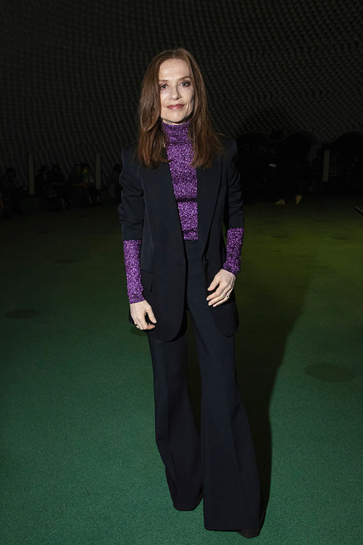 Isabelle Huppert en tailleur noir et col roulé violet