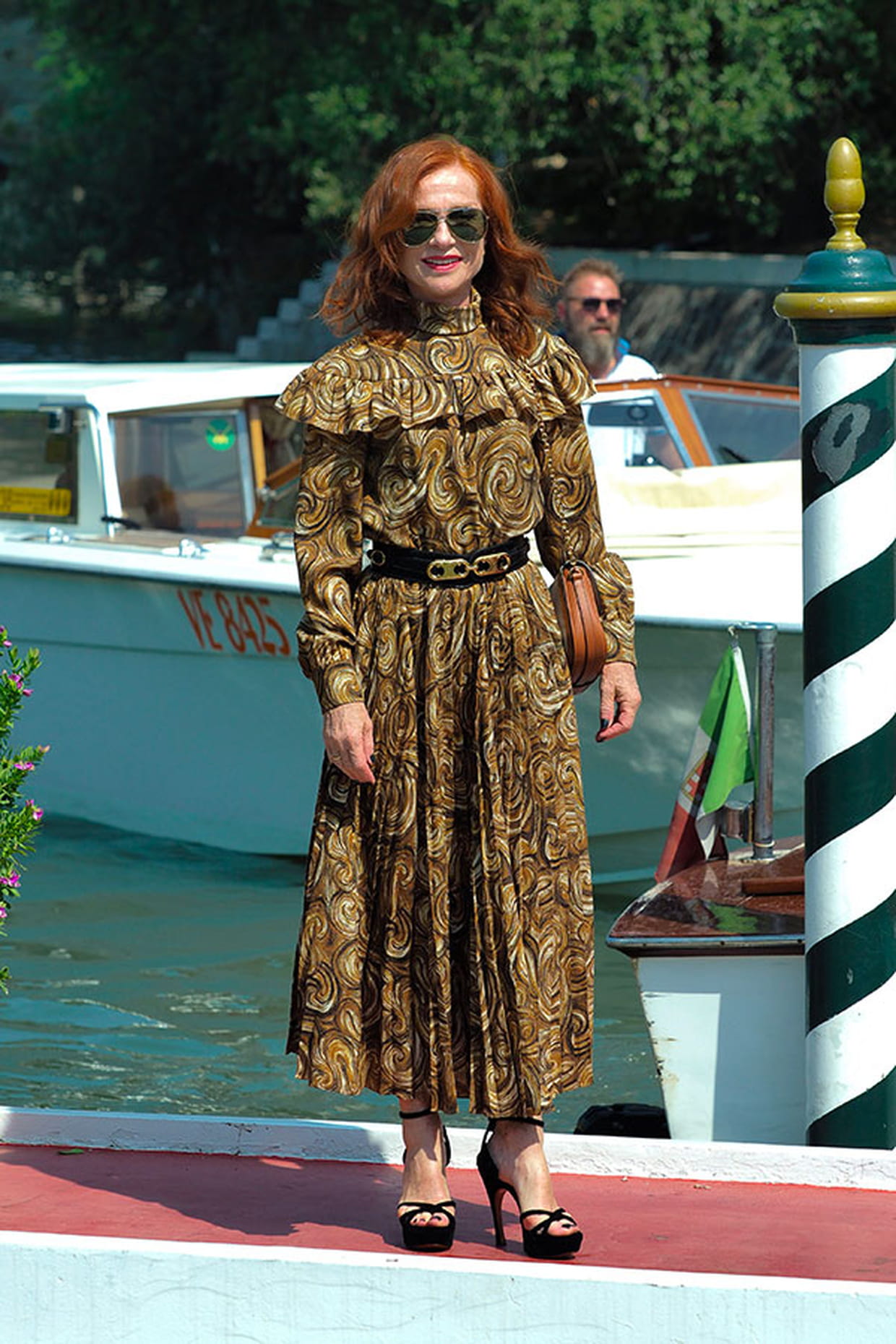 Isabelle Huppert en robe longue ceinturée lors de la 76ème édition du Festival du film de Venise le 1er septembre 2019.