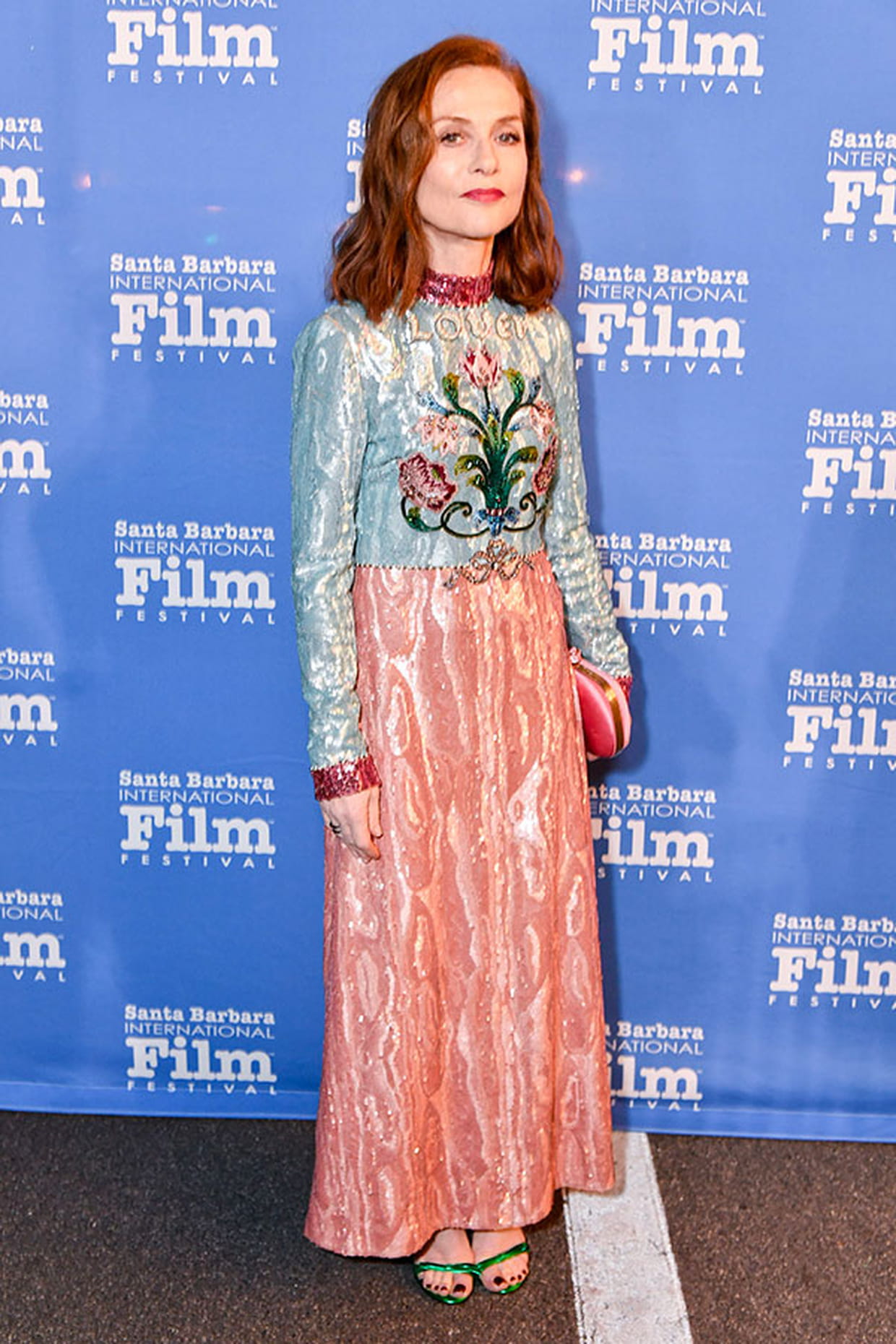 Isabelle Huppert en robe bicolore brodée de perles au Festival international du film de Santa Barbara le 8 février 2017.