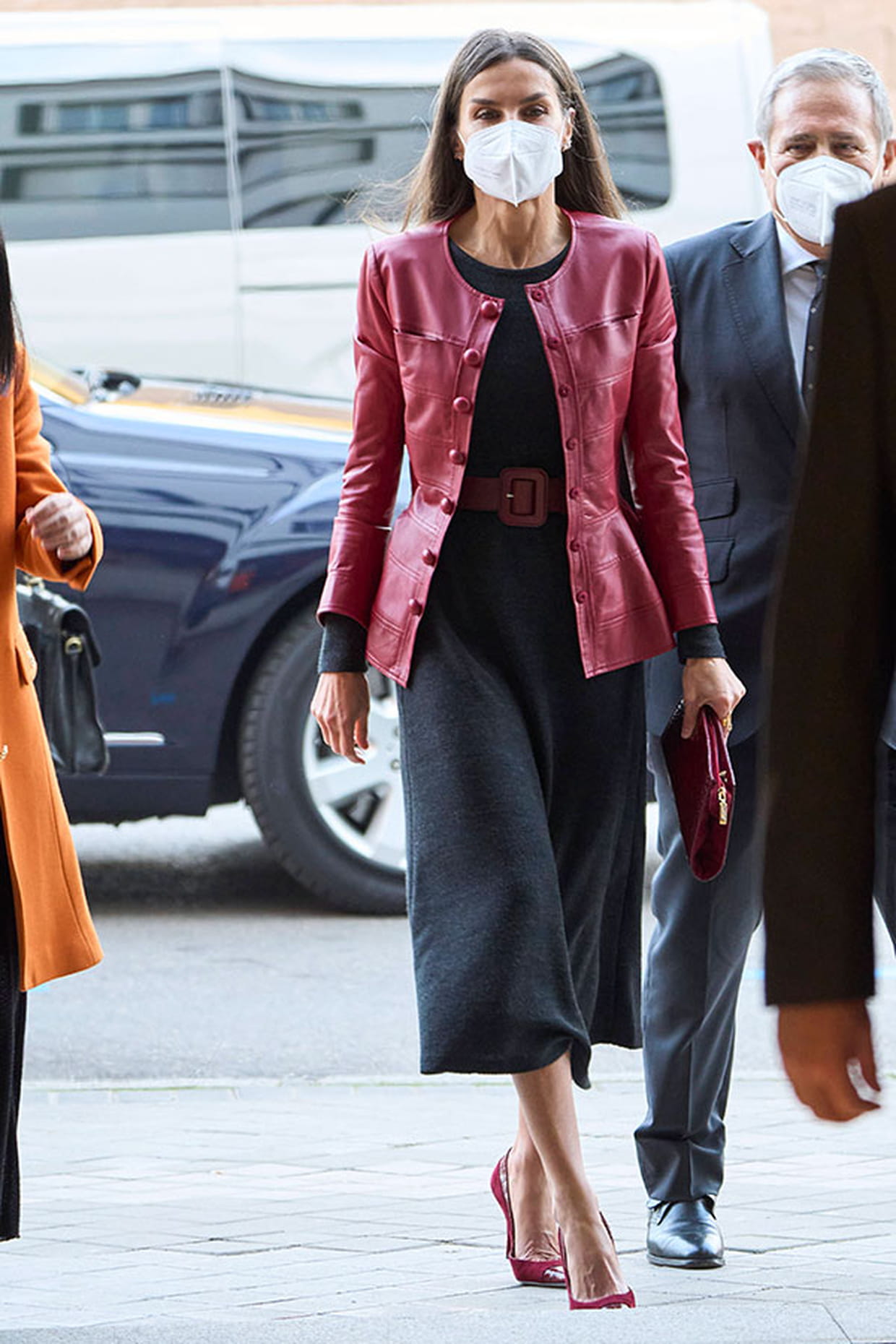Letizia d'Espagne en robe longue noire et veste bordeaux