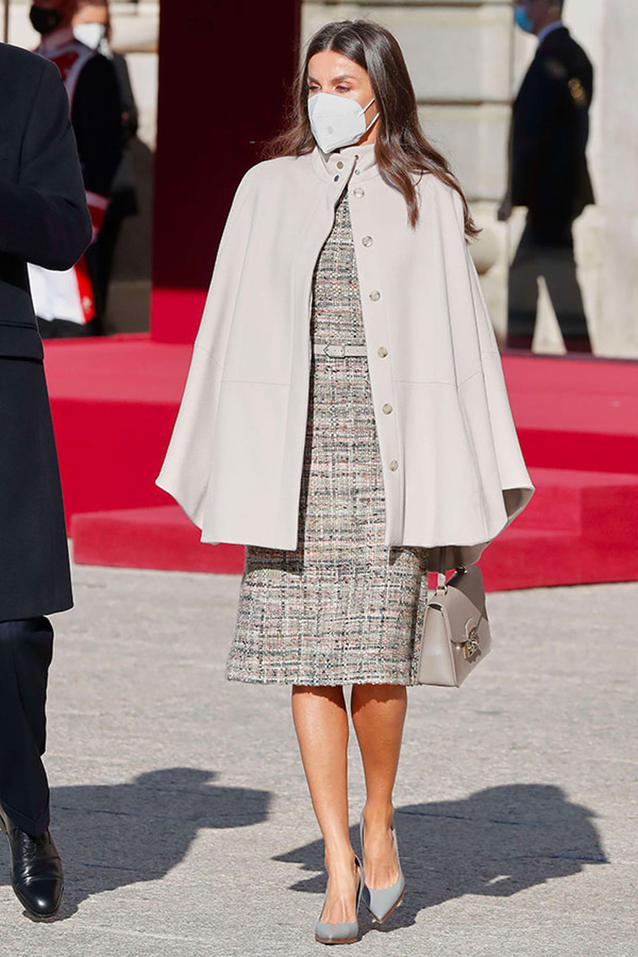 Letizia d'Espagne en robe fourreau façon tweed et cape crème