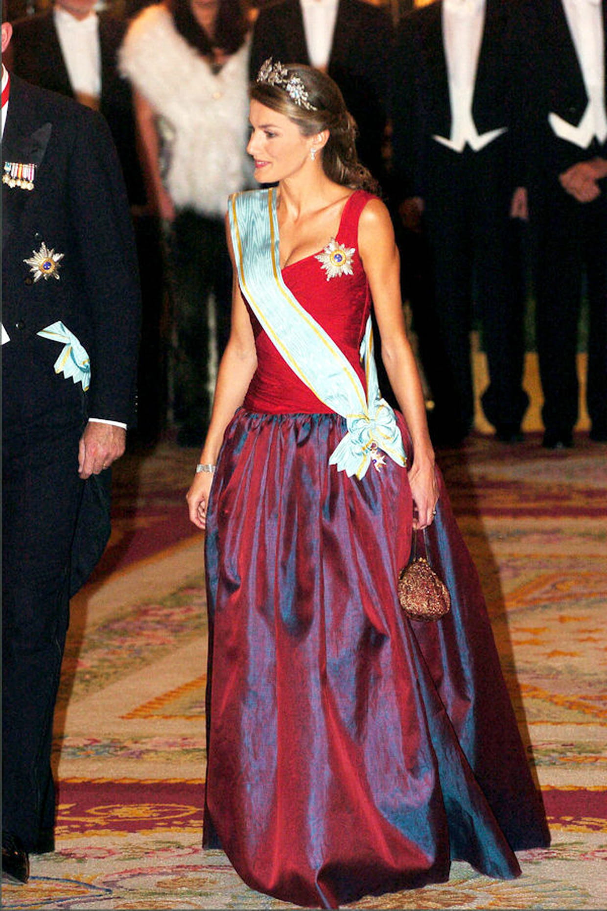 Letizia d'Espagne dans une robe rouge bouffante irisée au dîner de gala donné en l'honneur de présidente de la Lettonie Vaira Vīķe-Freiberga et de son mari Imants Freibergs à Madrid le 18 octobre 2004.