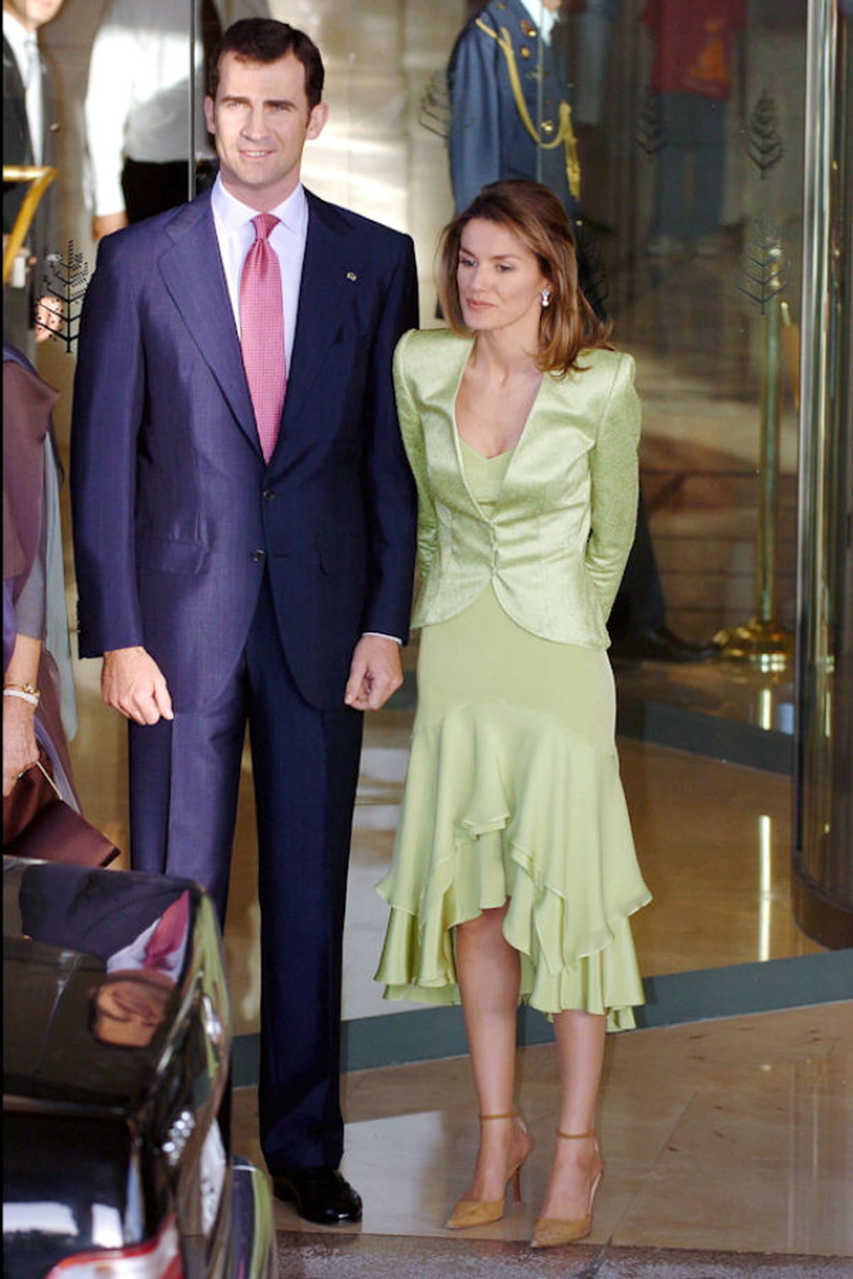 Letizia d'Espagne en blazer cintré vert et robe à volants avec le prince Felipe au mariage du prince Hamzah bin Hussein avec la princesse Noor bint Asem à Amman en Jordanie le 28 mai 2004.