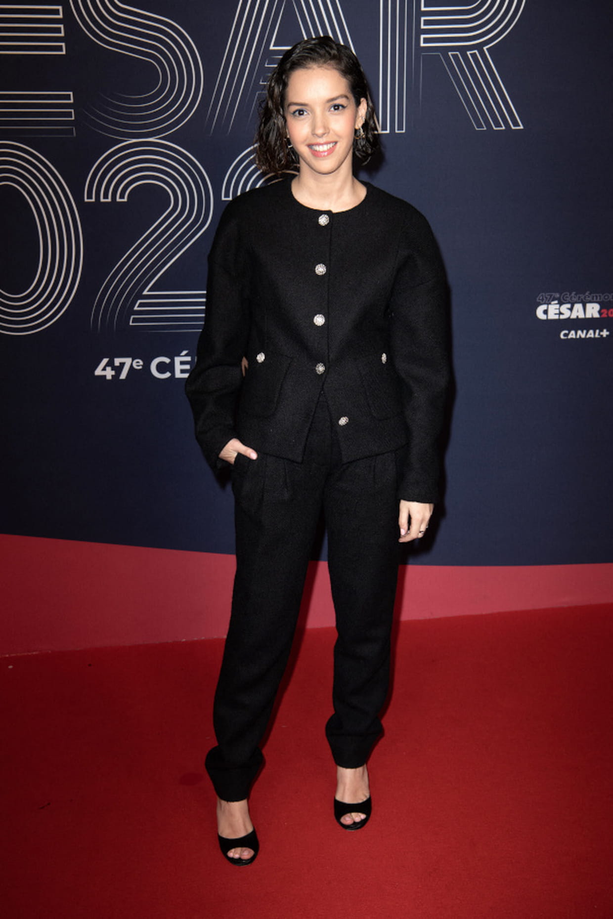 Lyna Khoudri en ensemble noir Chanel sur le tapis rouge de la 47ème cérémonie des César à l'Olympia de Paris le 25 février 2022.
