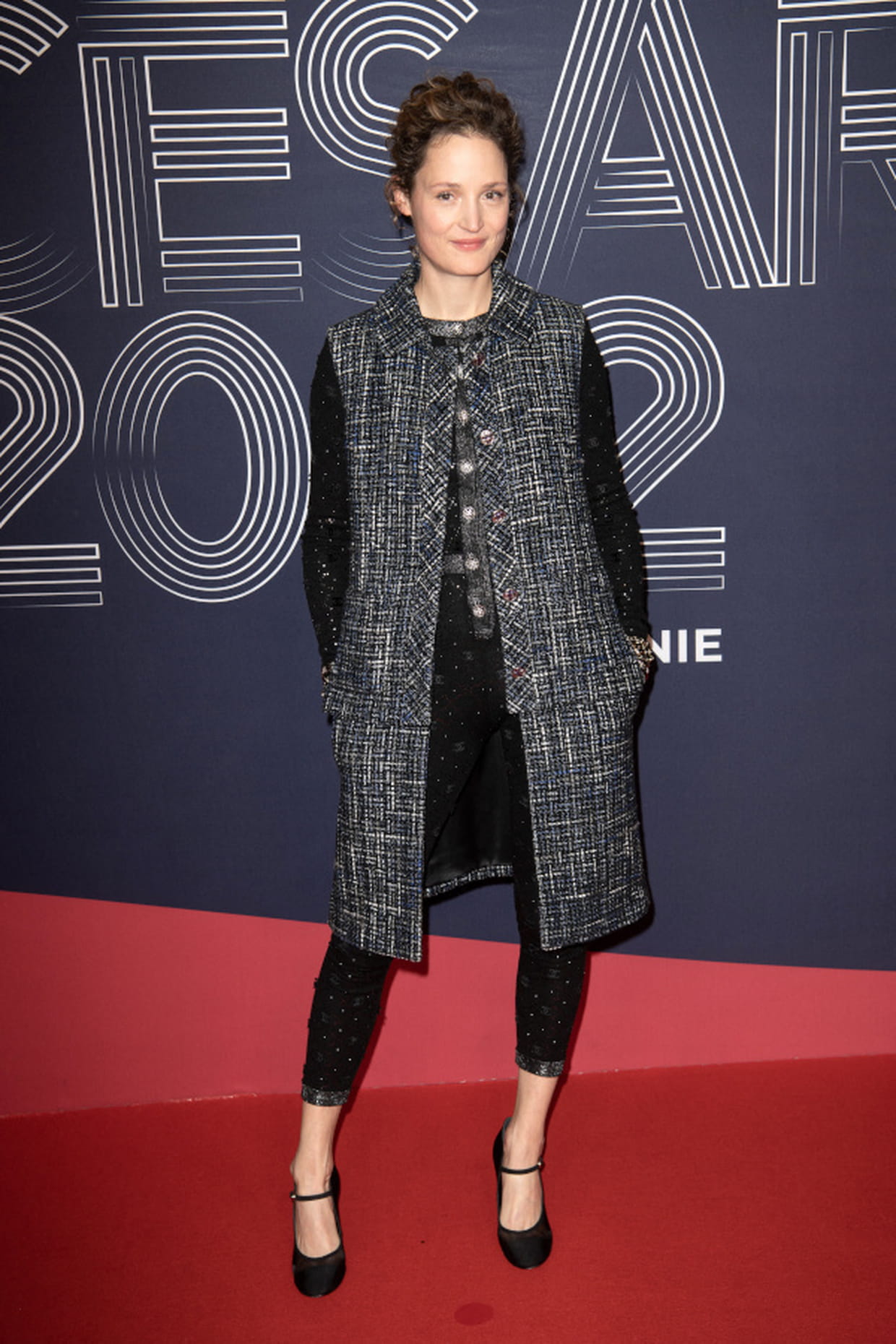 Vicky Krieps en veste sans manches Chanel sur le tapis rouge de la 47ème cérémonie des César à l'Olympia de Paris le 25 février 2022.