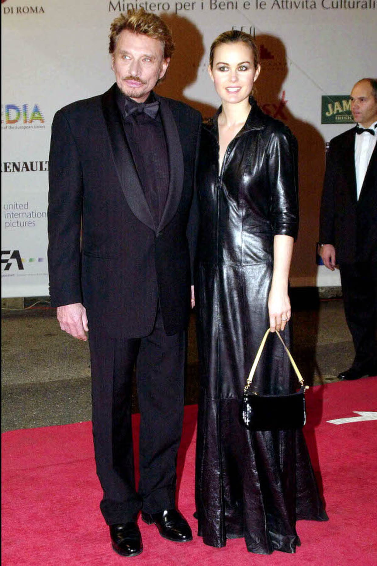Læticia Hallyday à 27 ans en robe longue en cuir avec Johnny Hallyday à la cérémonie des European Film Awards à Rome le 9 décembre 2002.