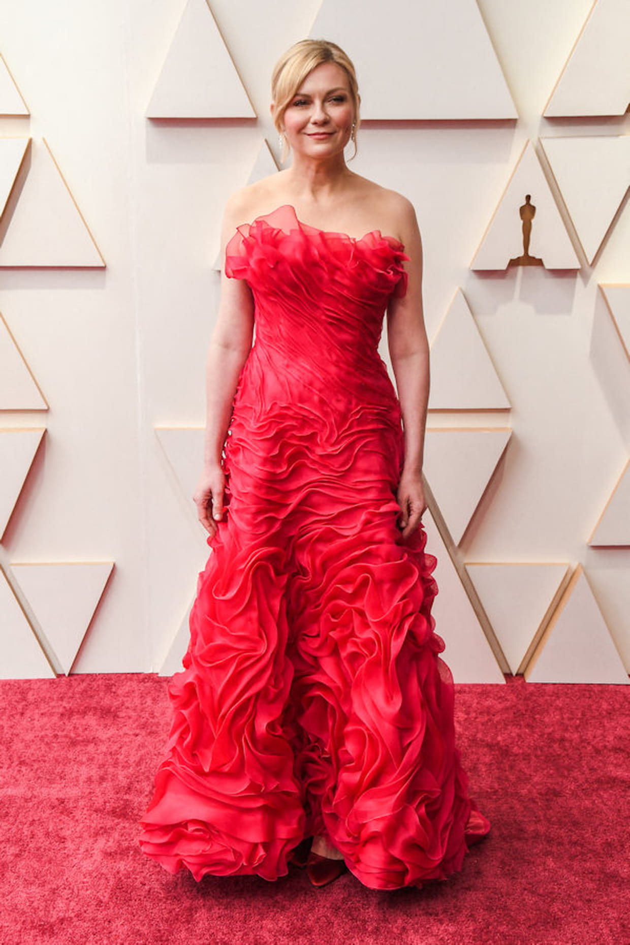 Kirsten Dunst en robe rouge Christian Lacroix vintage à la 94ème cérémonie des Oscars le dimanche 27 mars 2022 à Los Angeles.