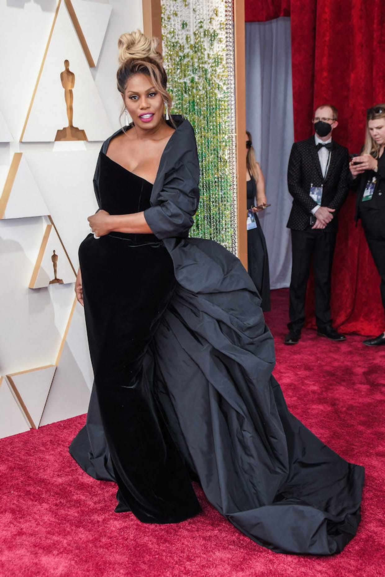 Laverne Cox en robe noire August Getty Atelier à la 94ème cérémonie des Oscars le dimanche 27 mars 2022 à Los Angeles.