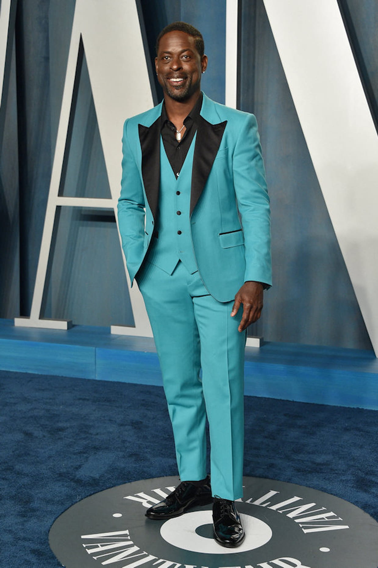 Sterling K. Brown en costume turquoise Dolce & Gabbana à l'after party Vanity Fair des Oscars le dimanche 27 mars 2022 à Los Angeles.