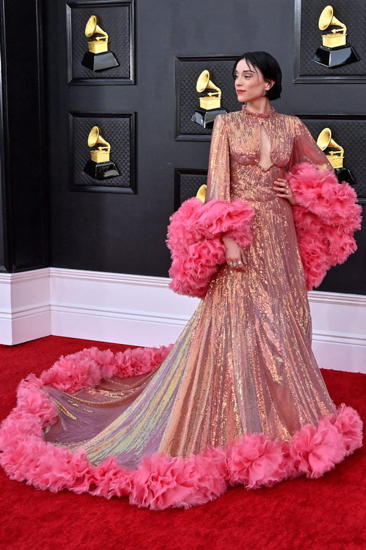 St. Vincent en robe Gucci à la 64ème cérémonie des Grammy Awards au MGM Grand Garden Arena de Las Vegas le 3 avril 2022.