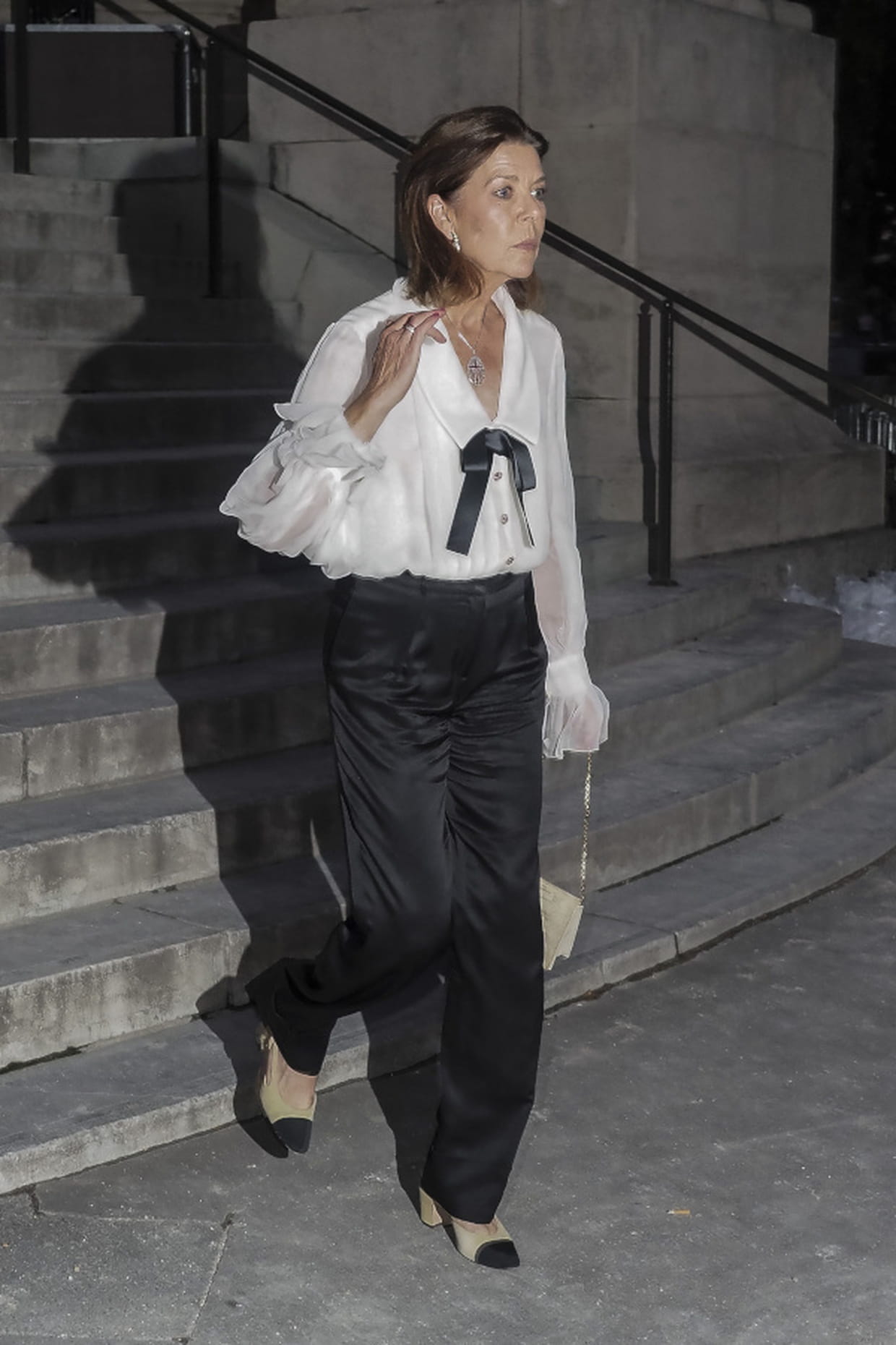 Après : Caroline de Monaco à 62 ans en chemisier blanc et pantalon satiné
