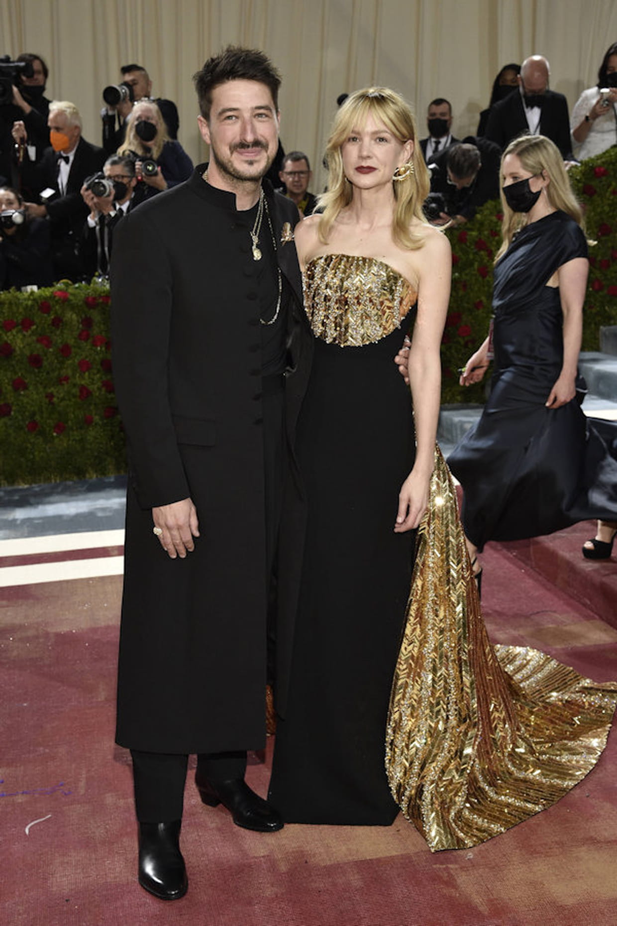 Marcus Mumford et Carey Mulligan en robe noir et doré Schiaparelli au Met Gala à New York le 2 mai 2022.