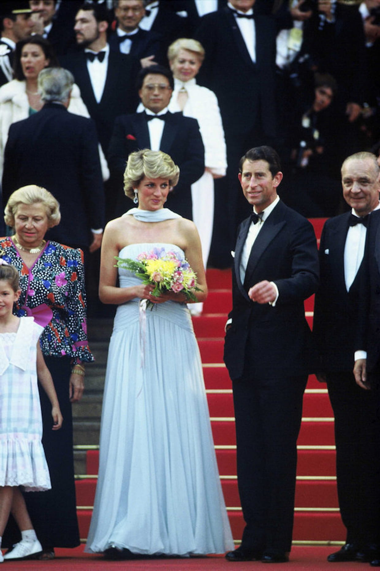 Lady Diana en robe bustier bleu ciel Catherine Walker lors du Festival de Cannes le 16 mai 1987.