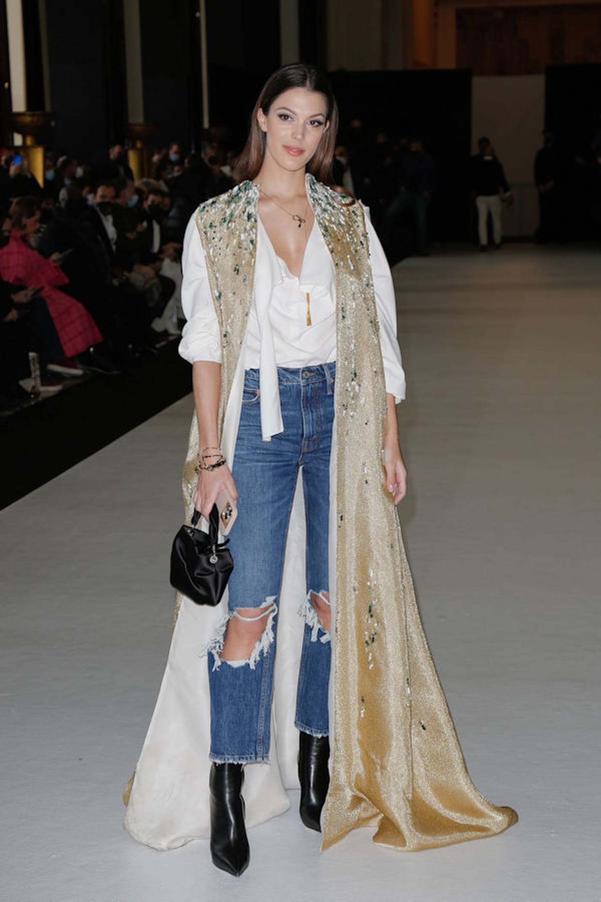 Iris Mittenaere en long gilet sans manches au défilé Stéphane Rolland printemps-été 2022 pendant la Fashion Week de Paris le 25 janvier 2022.