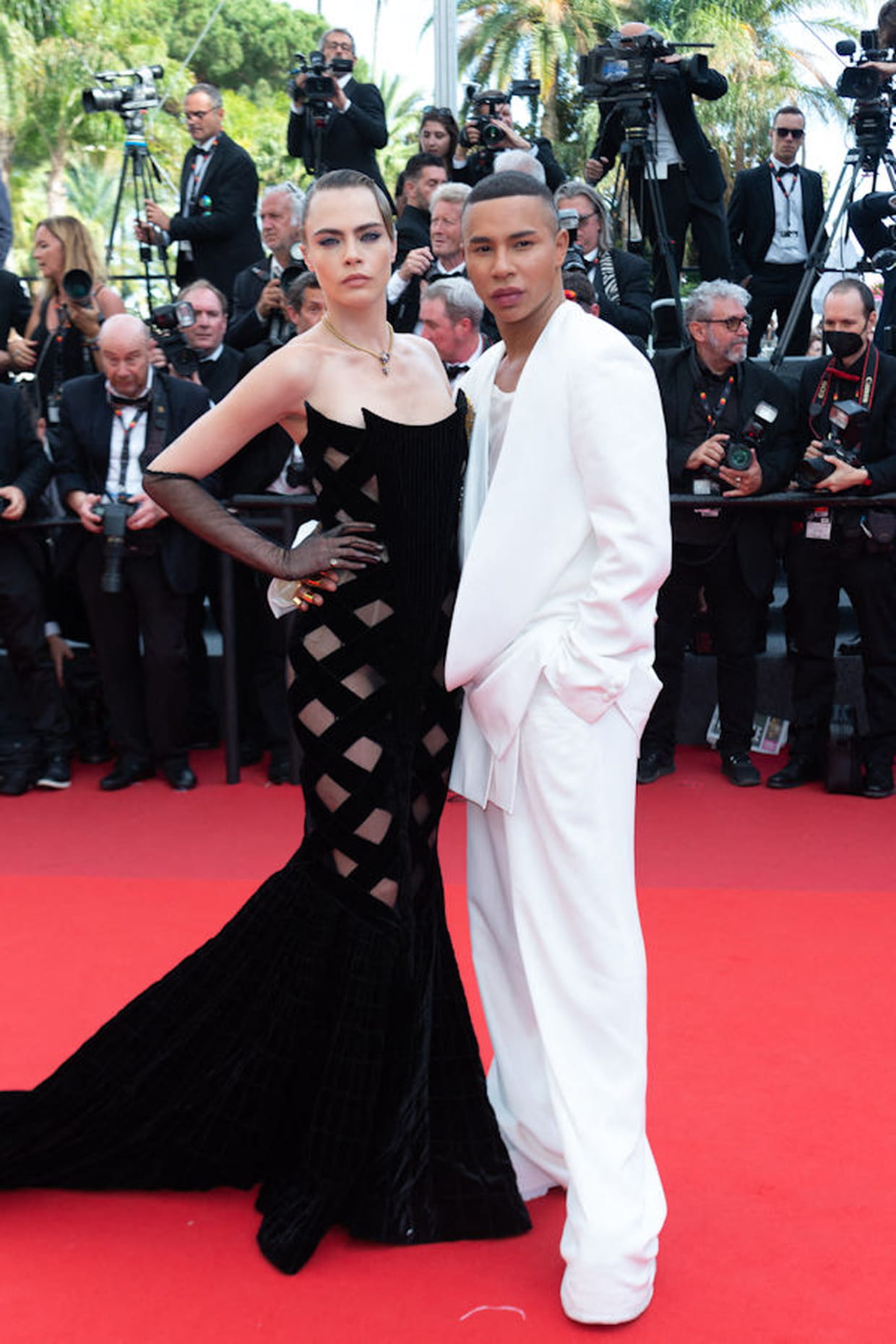 Cara Delevingne et Olivier Rousteing en robe bustier et costume blanc Balmain lors de la montée des marches du film "L'innocent" pendant le 75ème festival de Cannes le 24 mai 2022.
