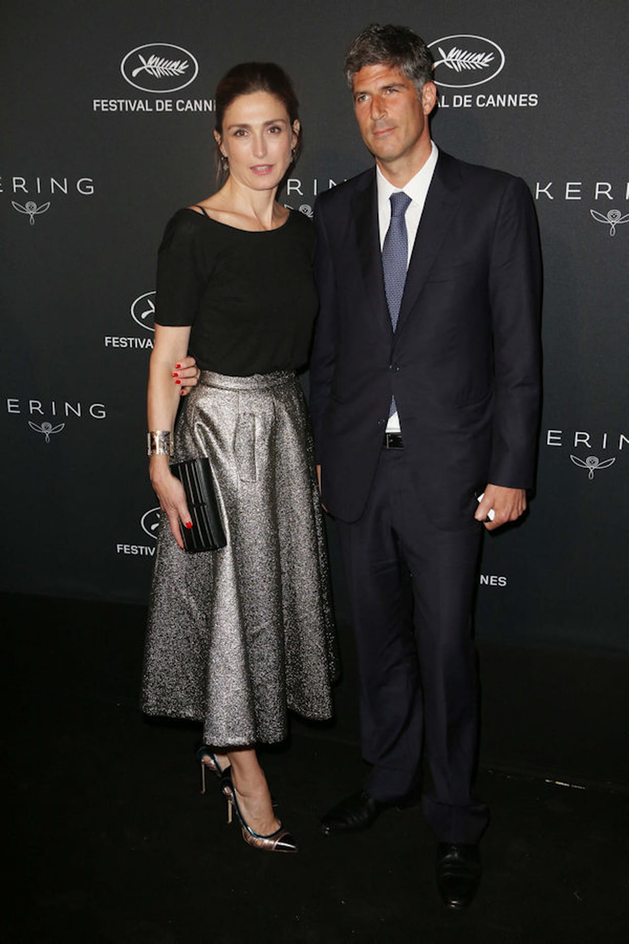 Julie Gayet en T-shirt noir et jupe longue argentée