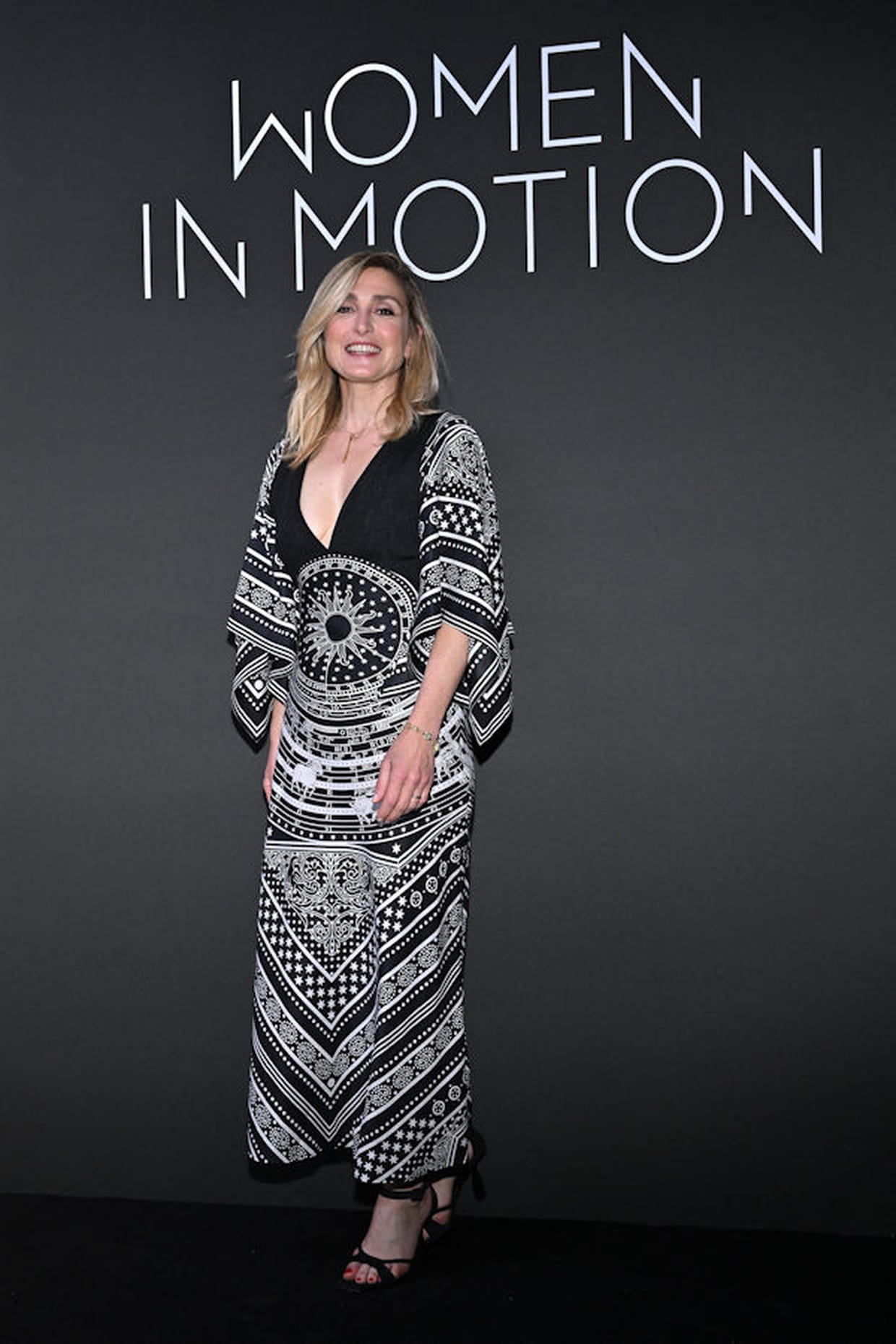 Julie Gayet en robe longue noir et blanc imprimée à la soirée Women in Motion de Kering pendant le Festival de Cannes le 21 mai 2023.