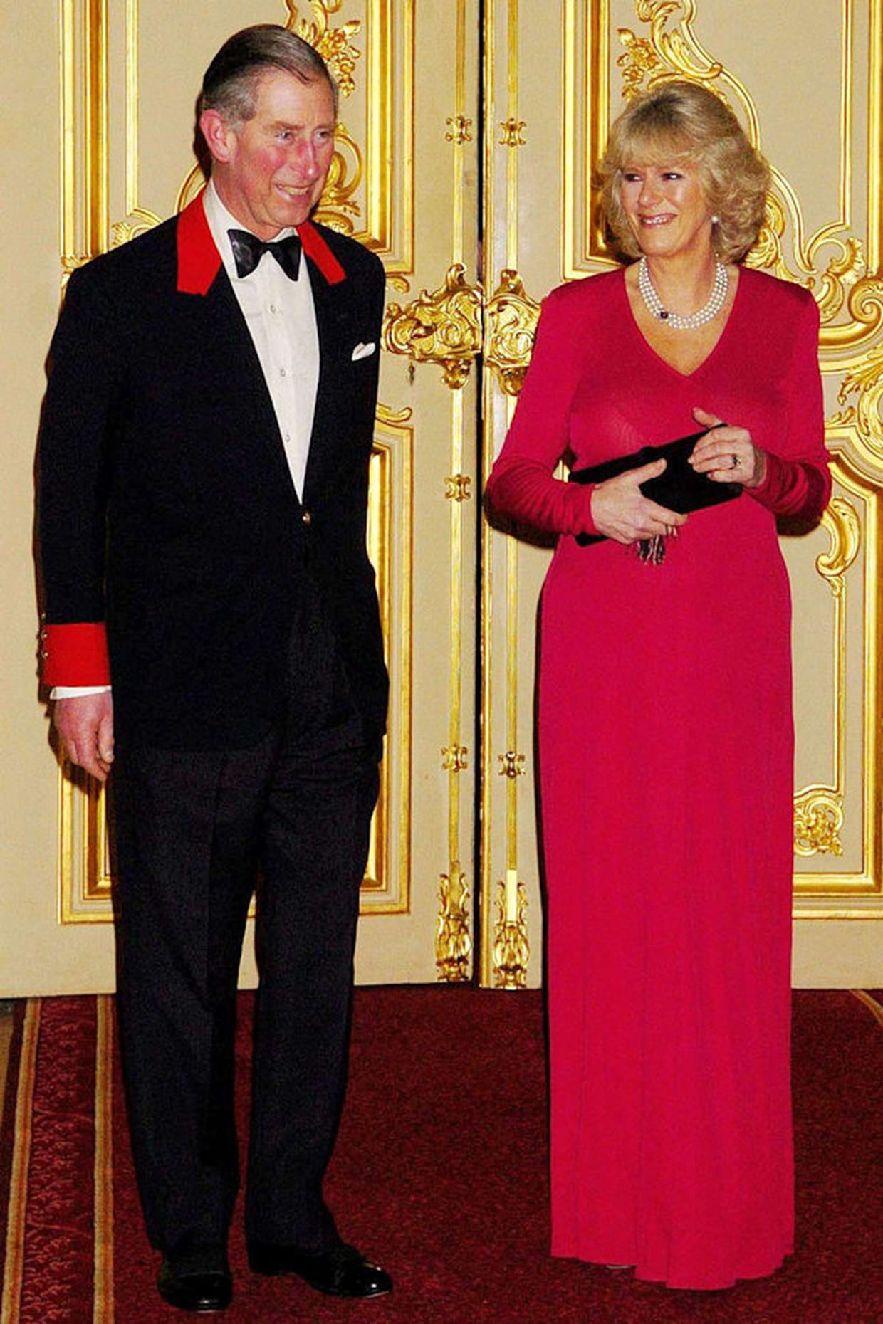 Camilla Parker-Bowles en longue robe rouge et pochette noire avec Charles III à une réception au château de Windsor le 10 février 2005.