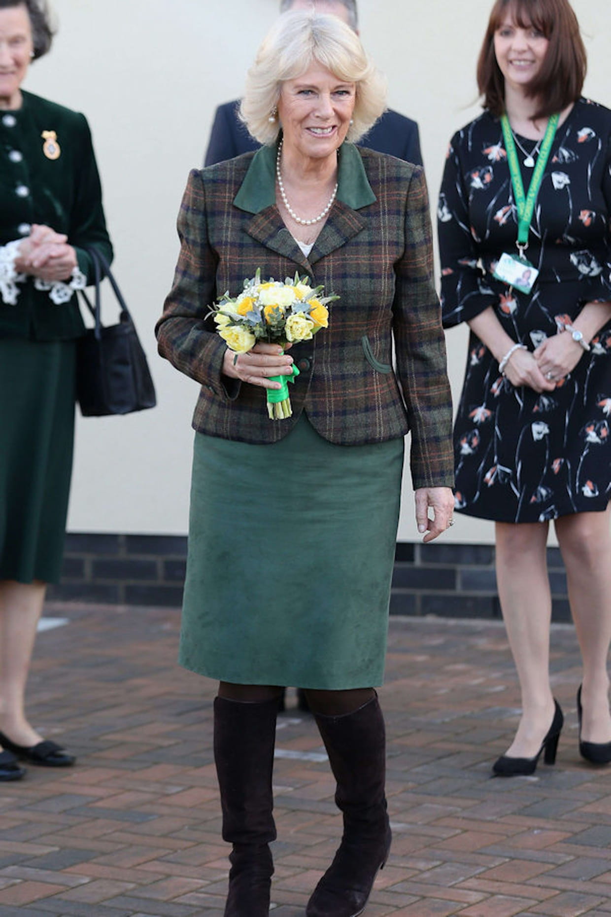 Camilla Parker-Bowles en blazer à carreaux et jupe crayon verte