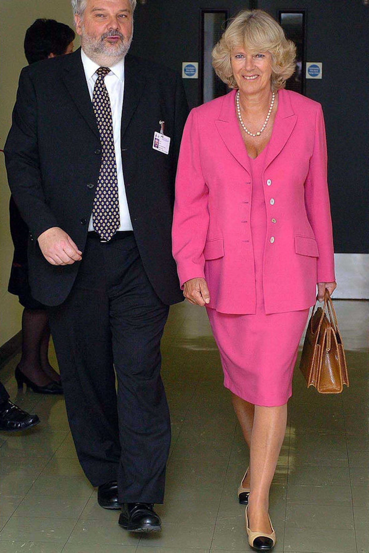 Camilla Parker-Bowles en tailleur rose vif et ballerines nude à bouts noirs
