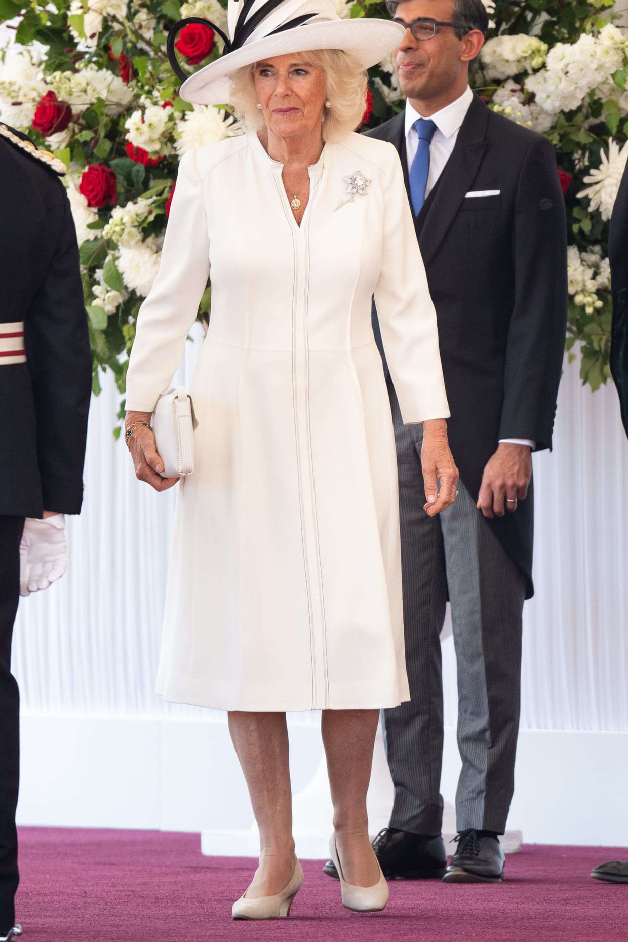 Camilla Parker-Bowles en robe midi blanche et bibi assorti