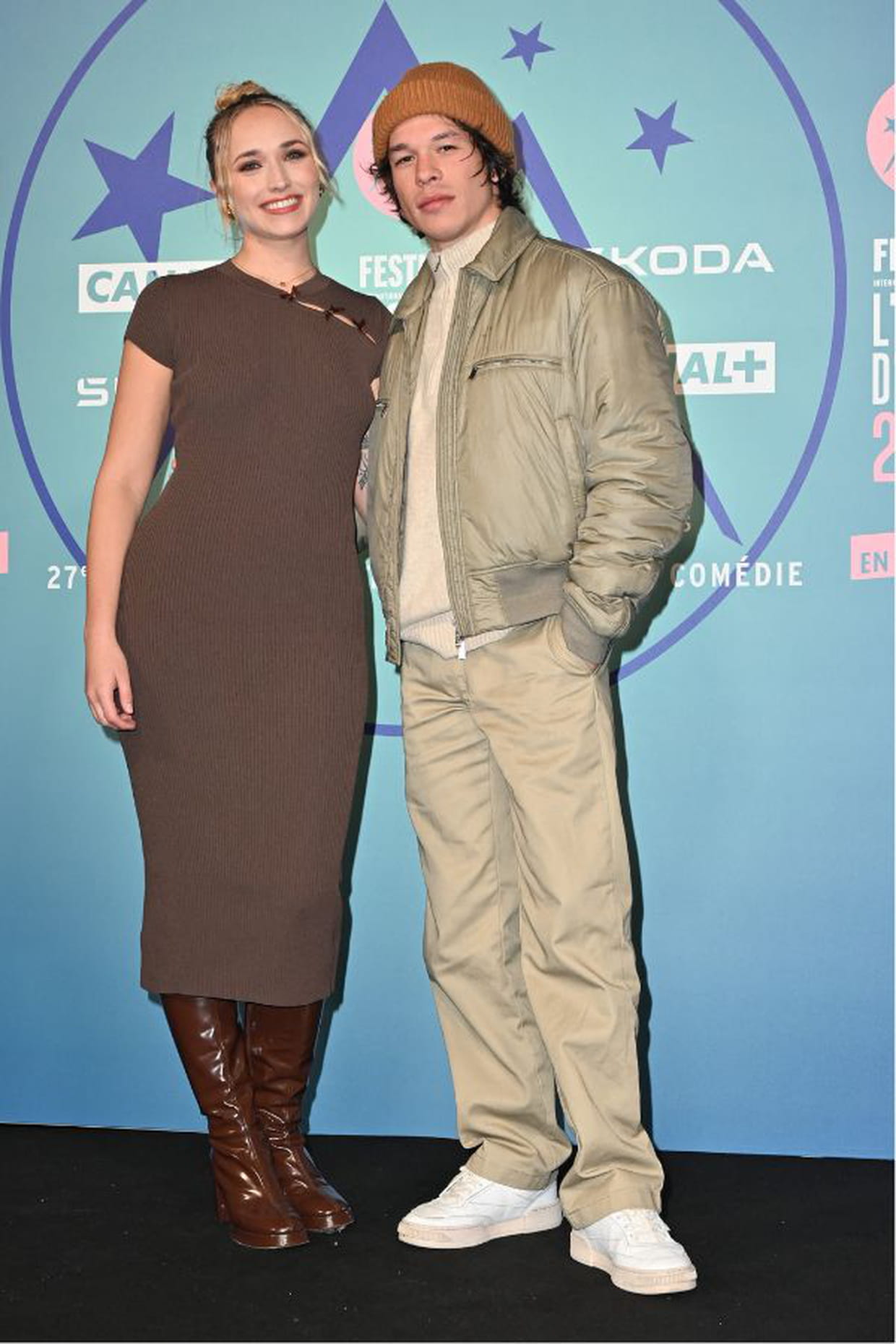 Chloé Jouannet en robe moulante chocolat et bottes vernies avec Sandor Funtek à la cérémonie de clôture de la 27ème édition du Festival International du Film de Comédie à l'Alpe d'Huez le 20 janvier 2024.