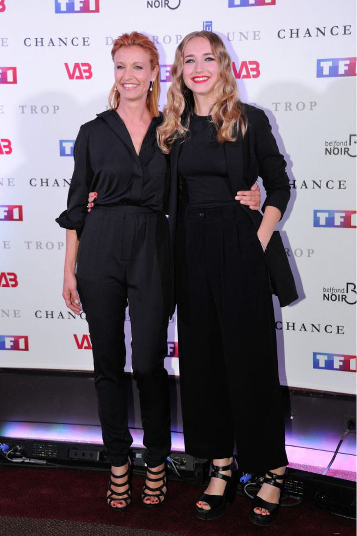 Chloé Jouannet en pantalon noir et veste de costume avec Alexandra Lamy à la projection de la série Une chance de trop à Paris le 25 juin 2015.