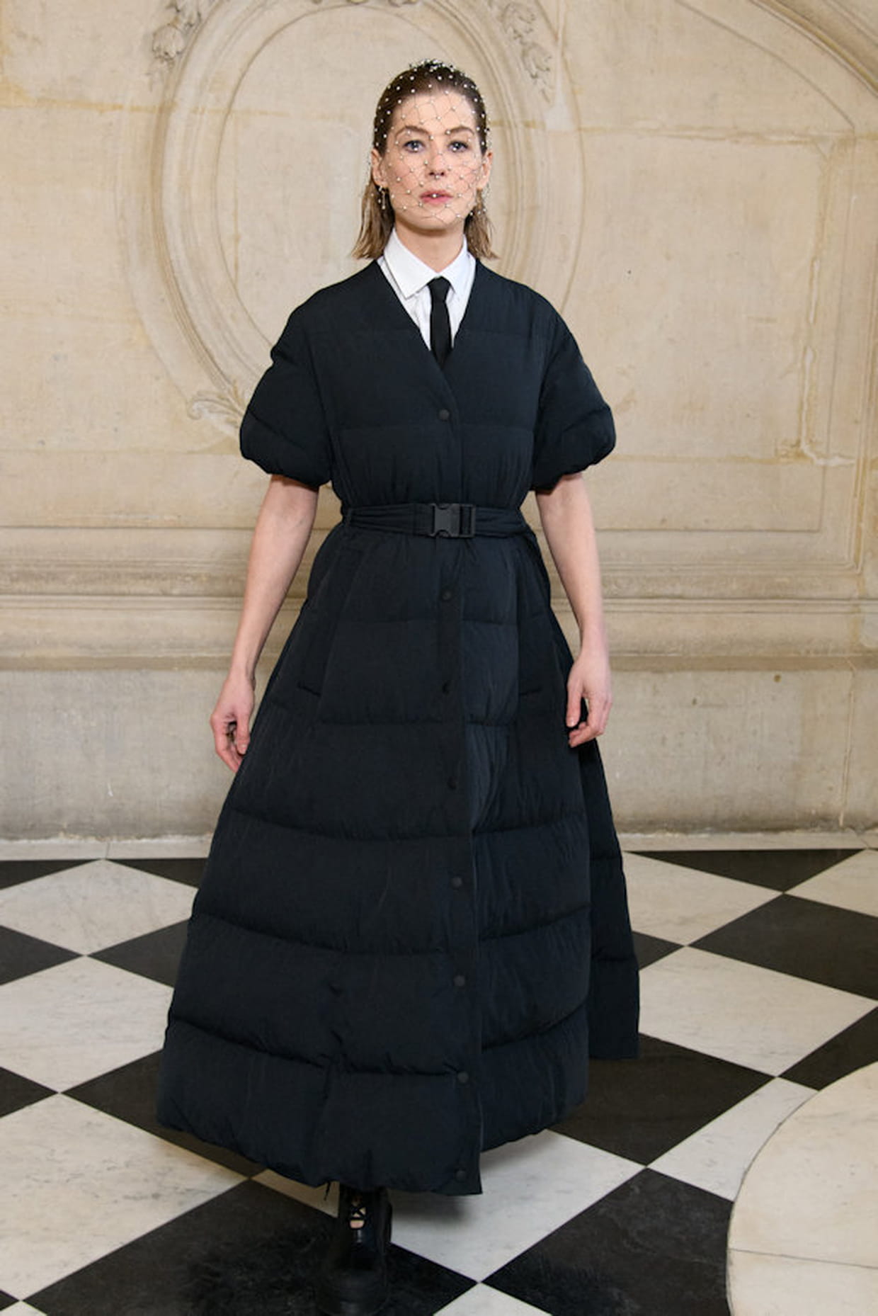 Rosamund Pike en robe noire et cravate au défilé Dior haute couture printemps-été 2022 lors de la Fashion week de Paris le 24 janvier 2022.
