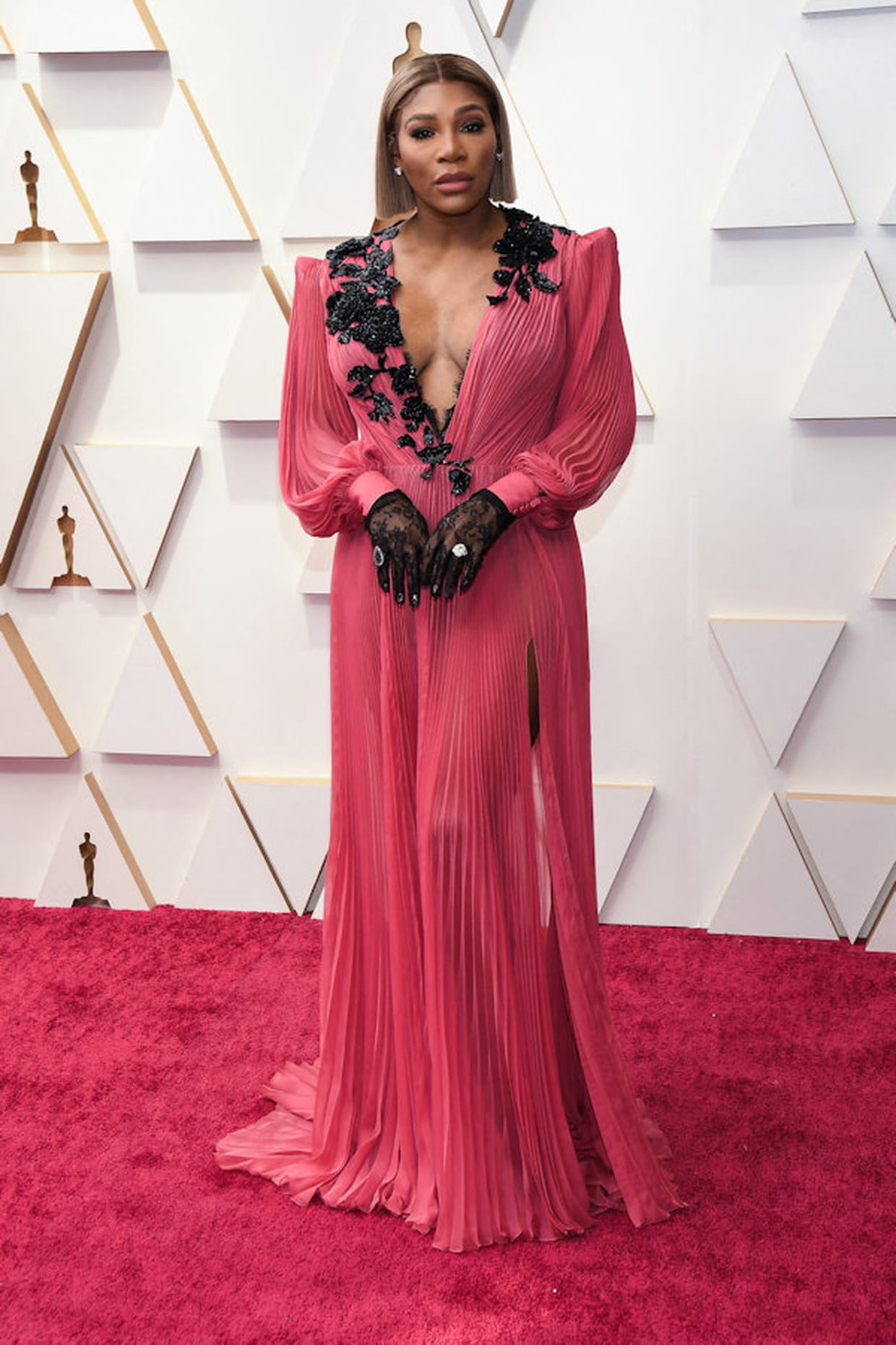 Serena Williams en robe rose longue plissée avec détails en dentelle à la 94ème cérémonie des Oscars le 27 mars 2022.