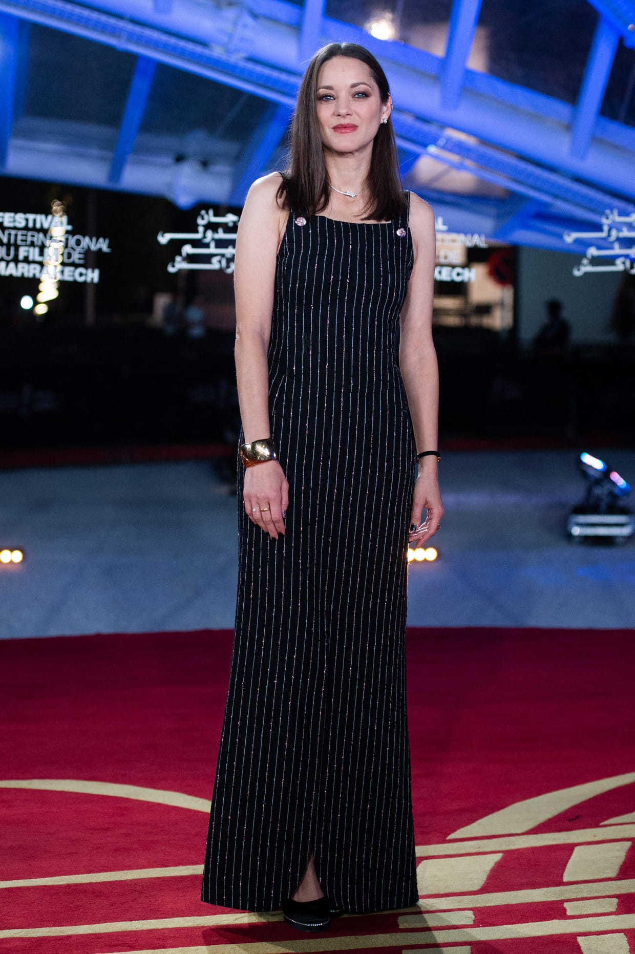 Marion Cotillard en robe noire rayée lors du 19ème festival de film de Marrakech le 12 novembre 2022.