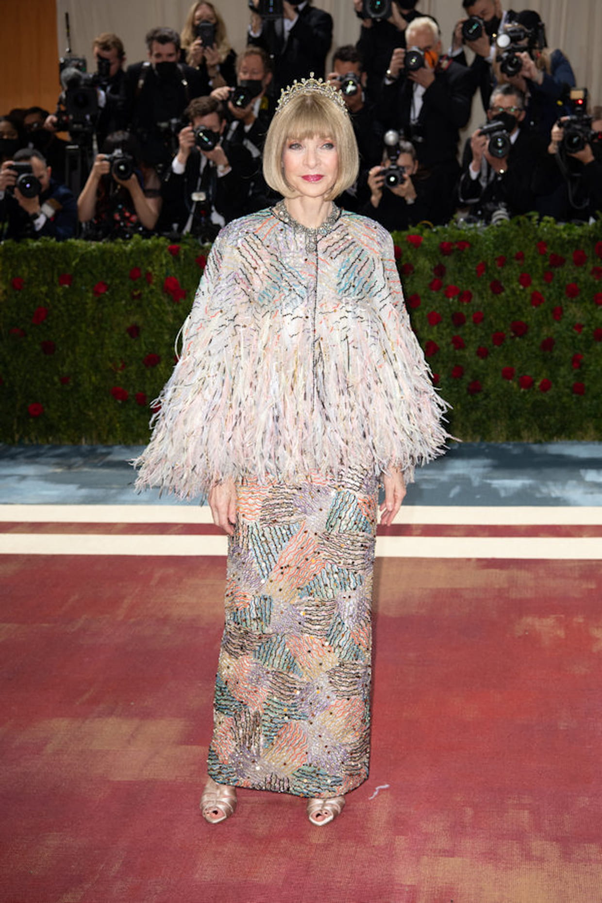 Anna Wintour en robe à plumes brodée et diadème lors du Met Gala à New York le 2 mai 2022.