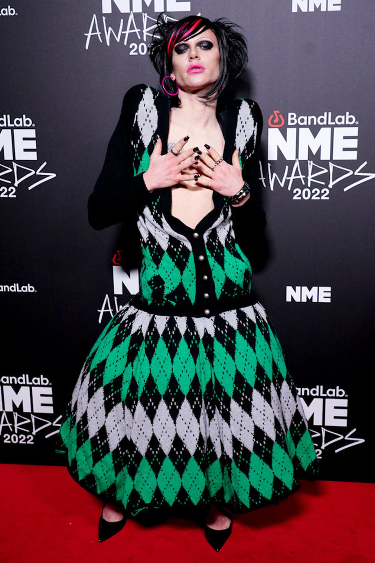Bimini Bon Boulash avec un gilet et une jupe à carreaux vert et noir lors des NME Awards à Londres le 2 mars 2022.