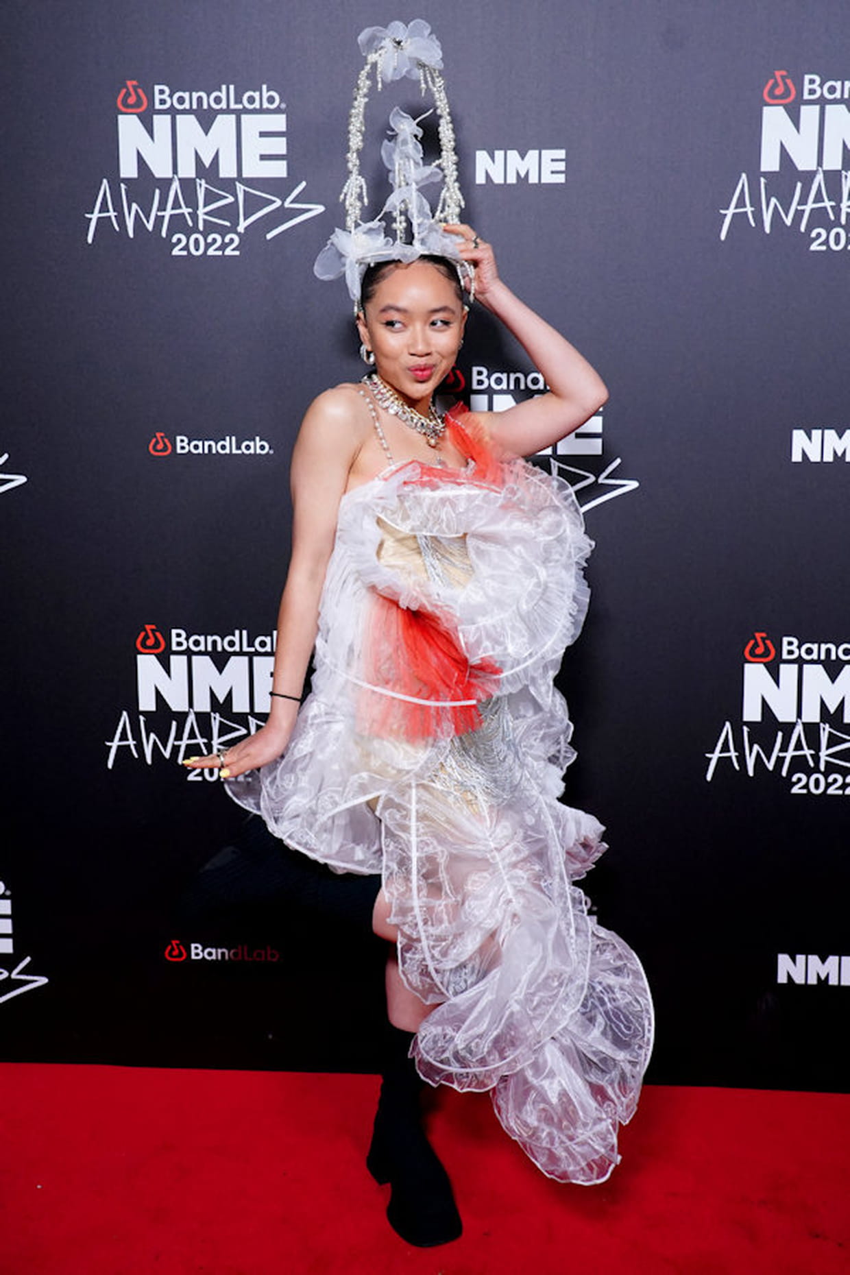Griff dans une robe en tulle blanc et rouge avec une coiffe haute lors des NME Awards à Londres le 2 mai 2022.