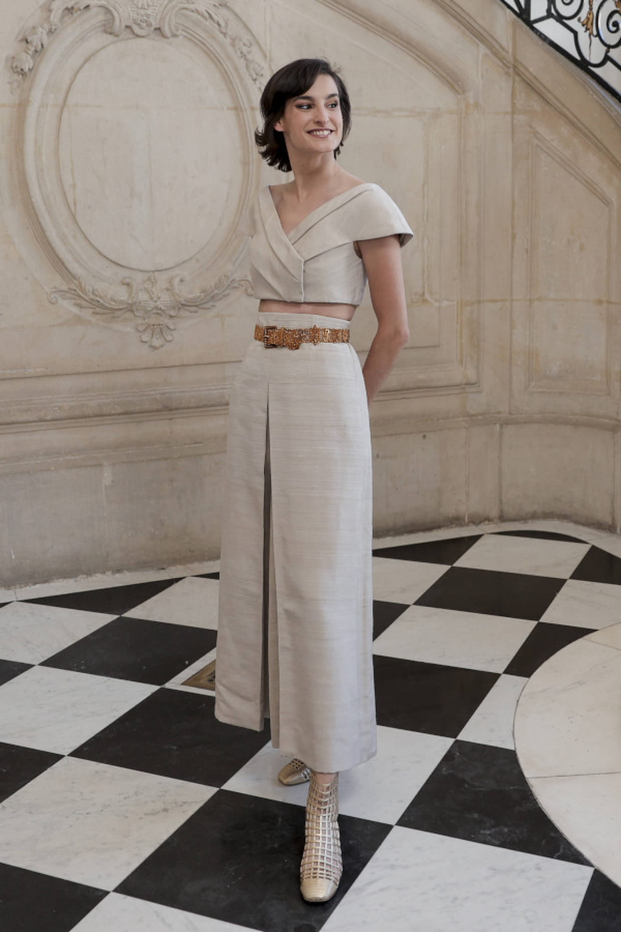 Nine d'Urso en ensemble beige au défilé Dior Haute Couture automne-hiver 2013 à Paris le 4 juillet 2022.