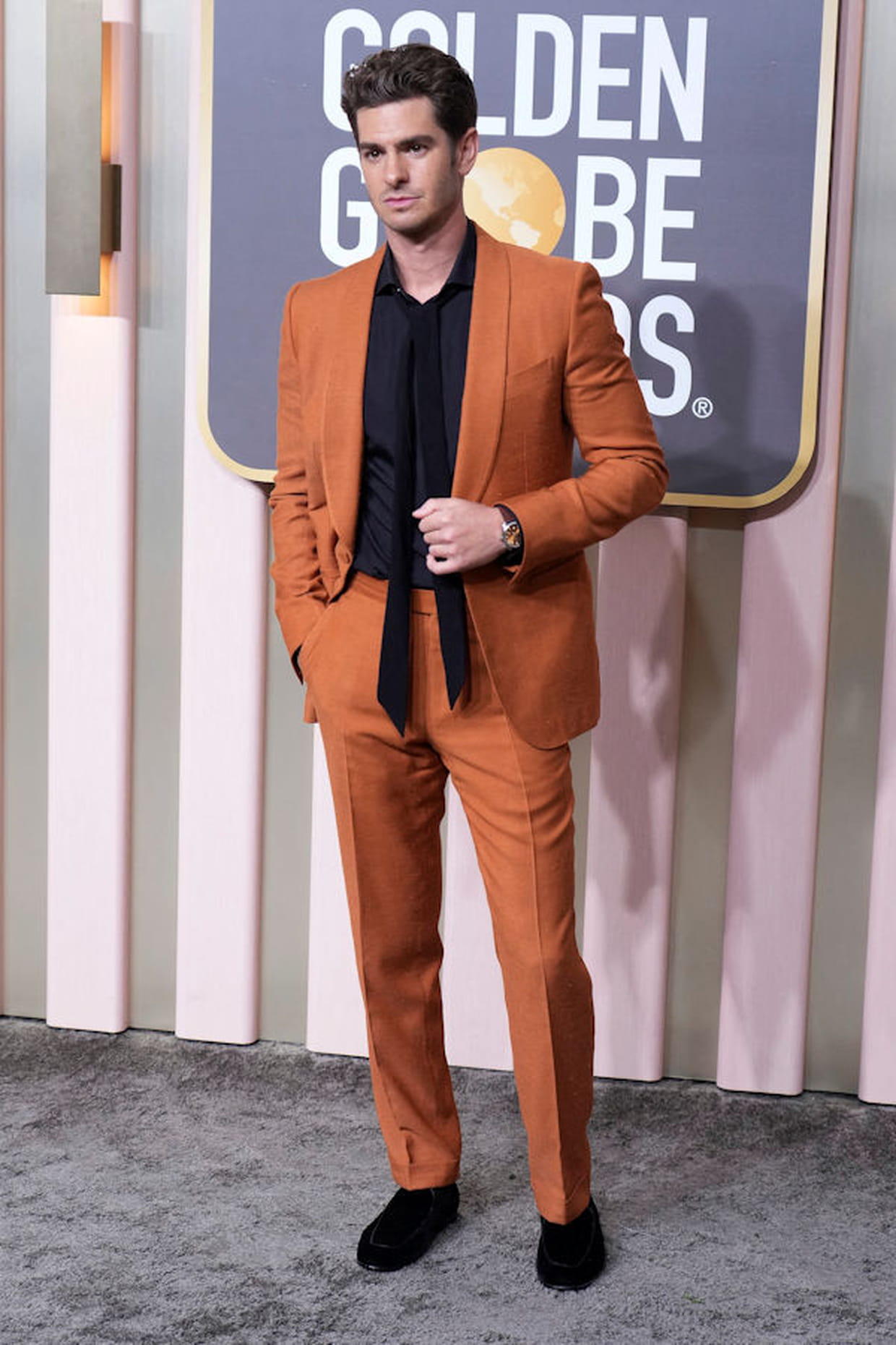 Andrew Garfield en costume orange Zegna à la 80ème cérémonie des Golden Globes à Los Angeles le 10 janvier 2023.