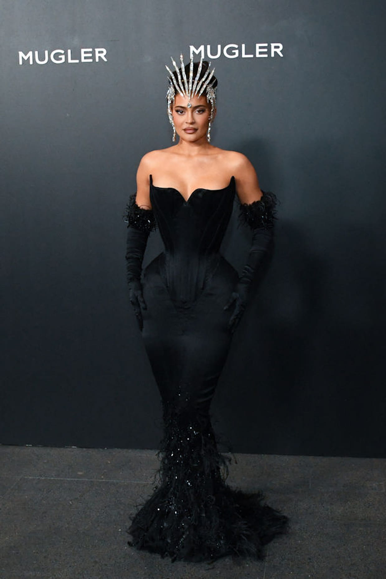 Kylie Jenner en robe noire bustier à strass et à plumes Mugler