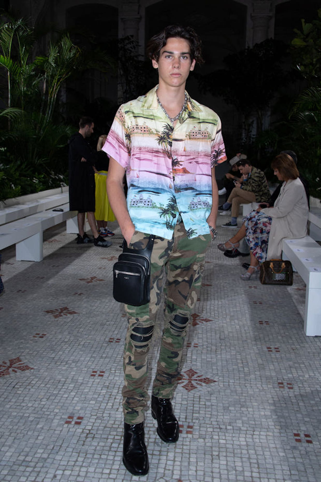 Paris Brosnan au chemise multicolore et pantalon imprimé militaire au défilé Amiri pendant la Fashion week homme printemps-été 2020 à Paris le 20 juin 2019.