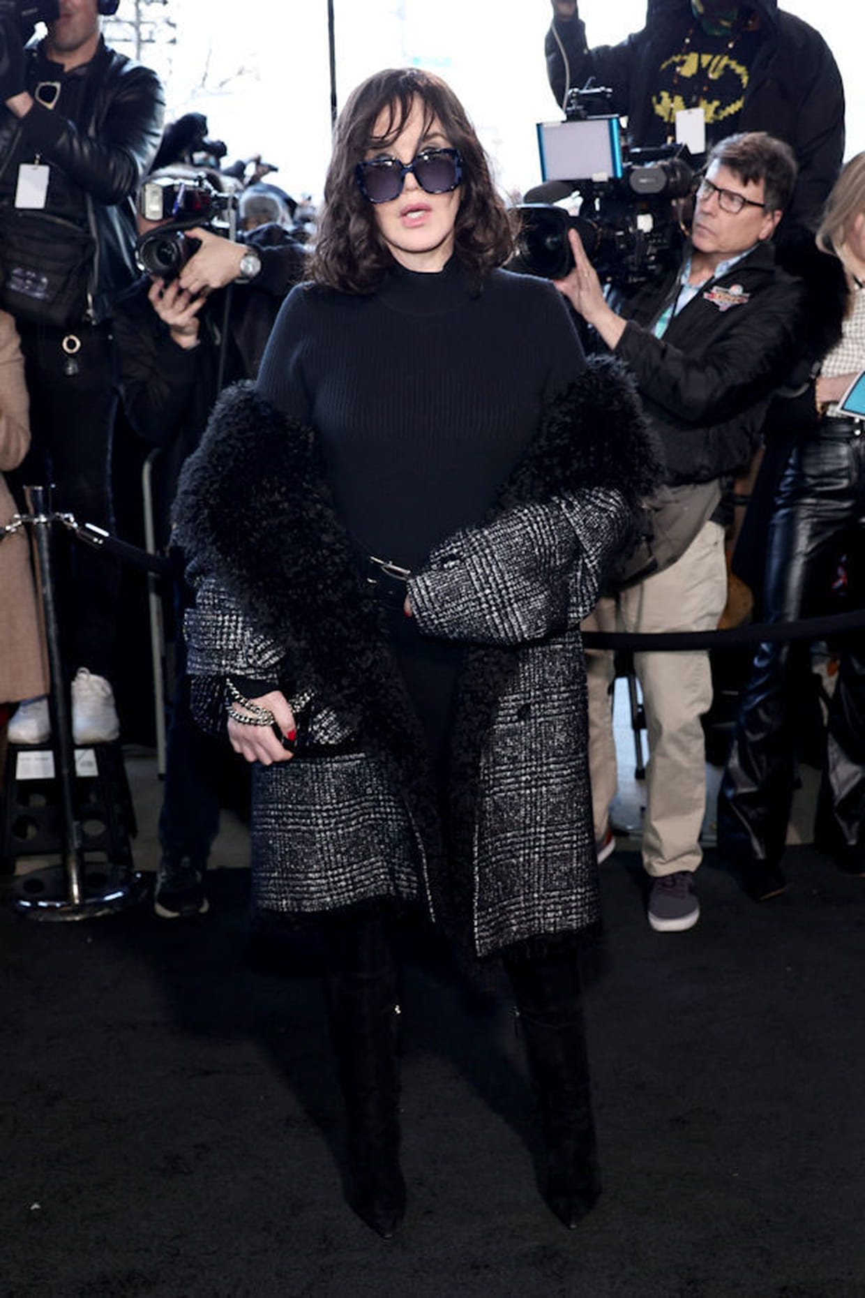 Isabelle Adjani en robe en maille et manteau en moumoute et tartan au défilé Michael Kors pendant la Fashion week automne-hiver 2023-2024 à New York le 15 février 2023.