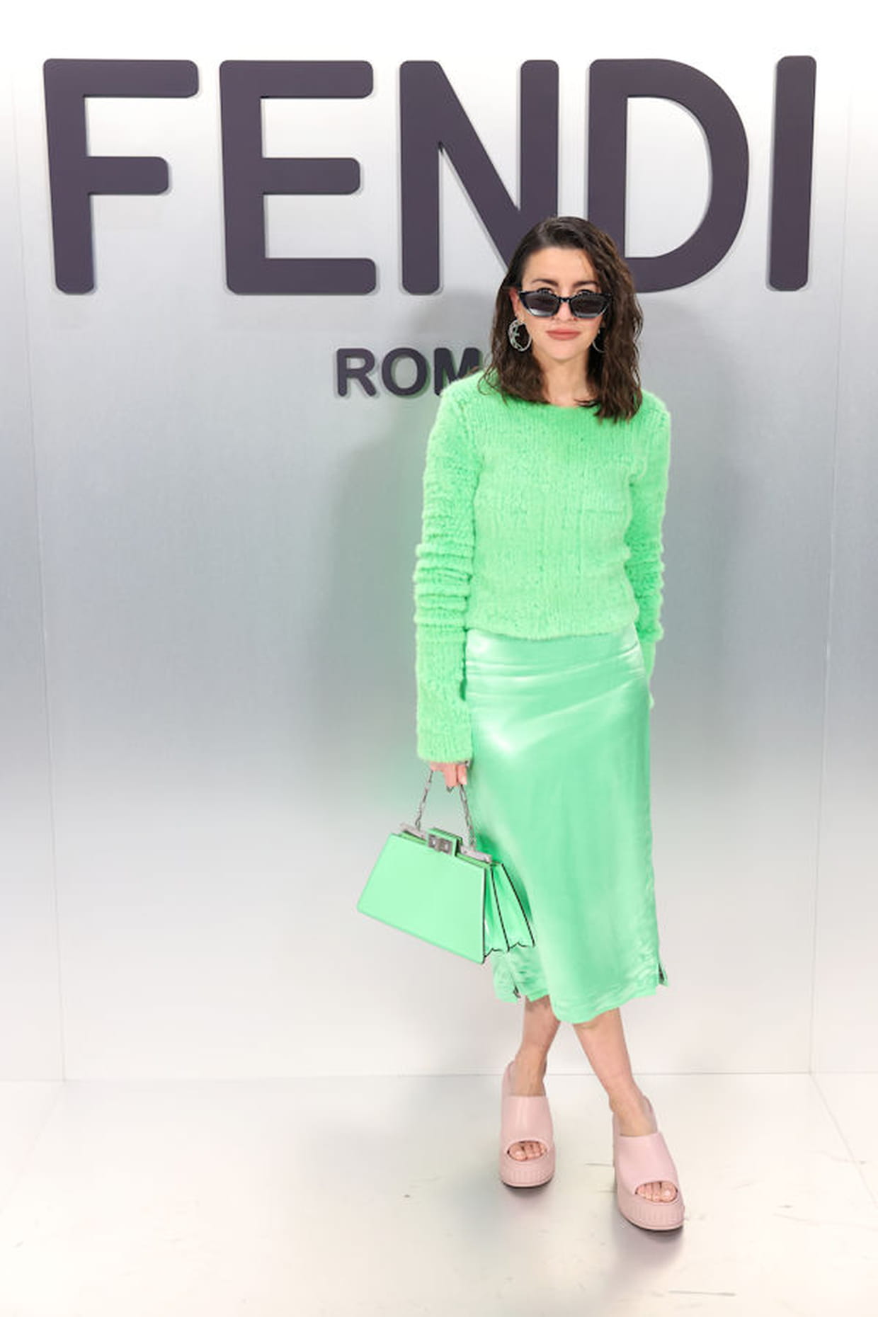 Alexandra Pereira en ensemble vert avec un pull manches longues et une jupe midi satinée au défilé Fendi