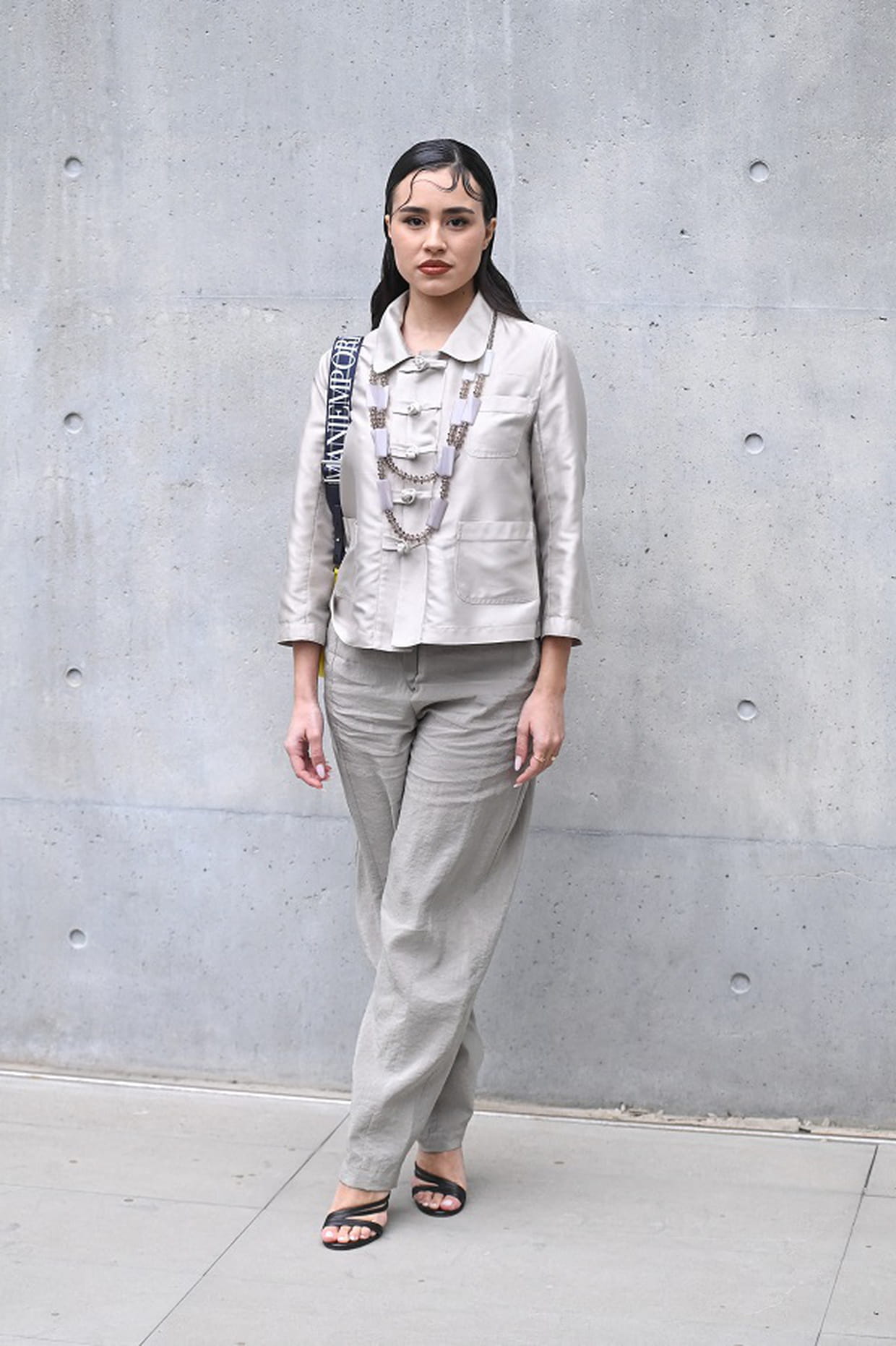 Clotilde Esposito en chemisier à boutons et pantalon clair ample au défilé Emporio Armani