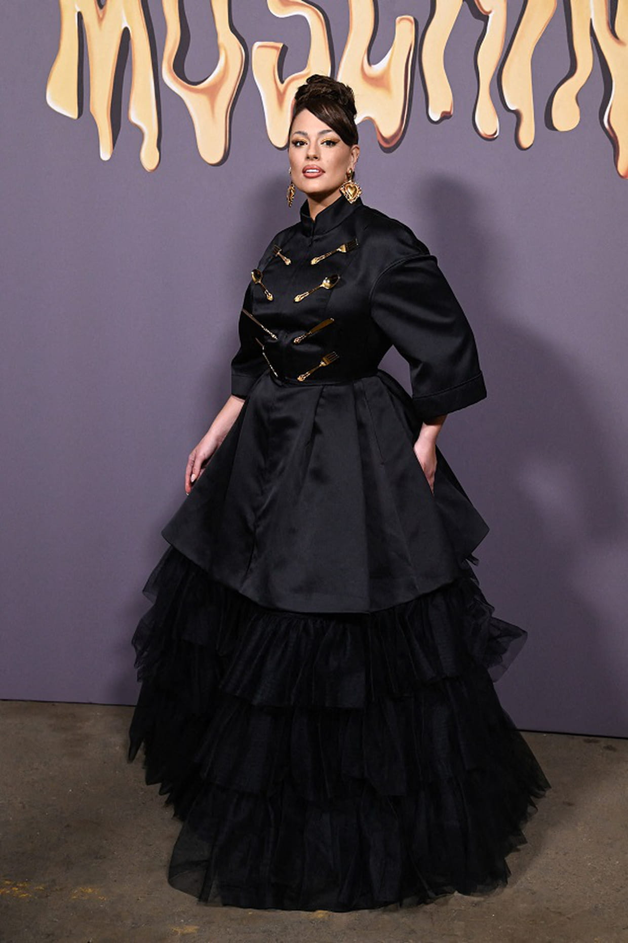 Ashley Graham en robe maxi noire bi-matière et col montant au défilé Moschino