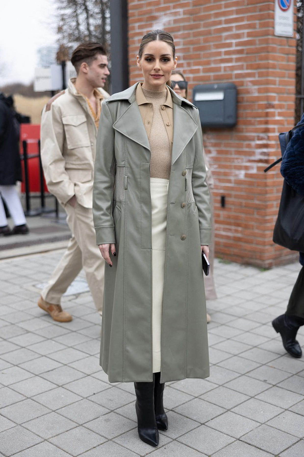 Olivia Palermo en trench et bottes noires pointues au défilé Tod's