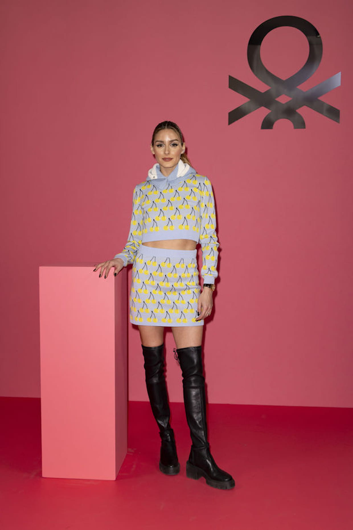 Olivia Palermo en ensemble gilet à capuche et jupe courte à imprimé cerise au défilé Benetton