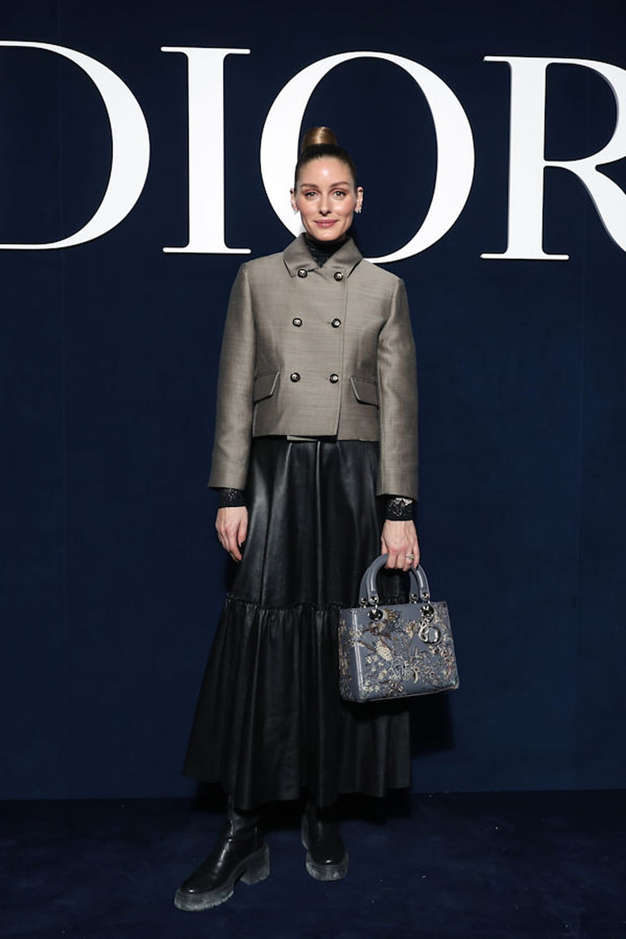 Olivia Palermo en veste courte cintrée et jupe en cuir évasée au défilé Dior
