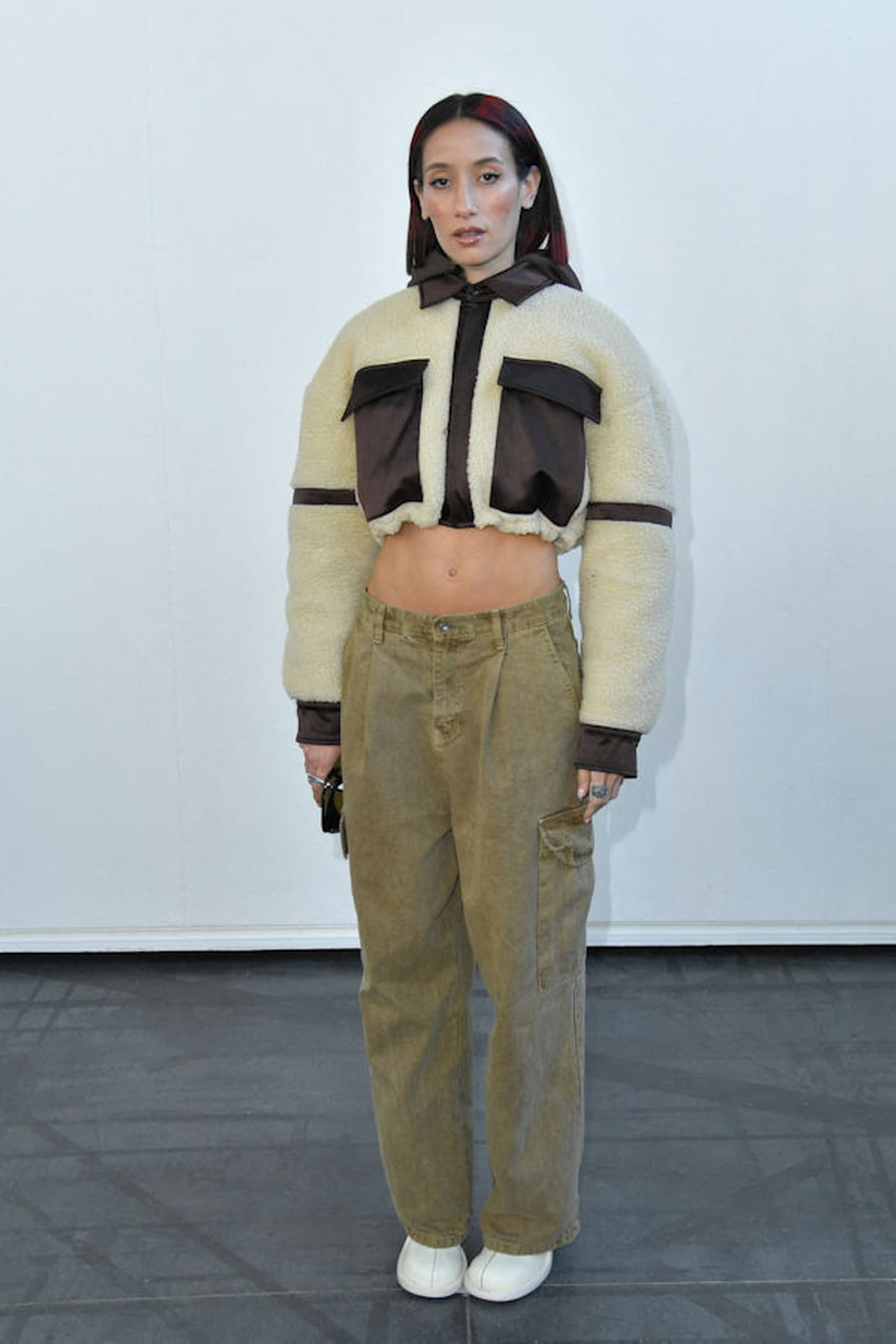 Alexandra Guerain en mini veste bi-matière et jean droit kaki à poche au défilé Maitrepierre pendant la Fashion week automne-hiver 2023-2024 à Paris le 28 février 2023.
