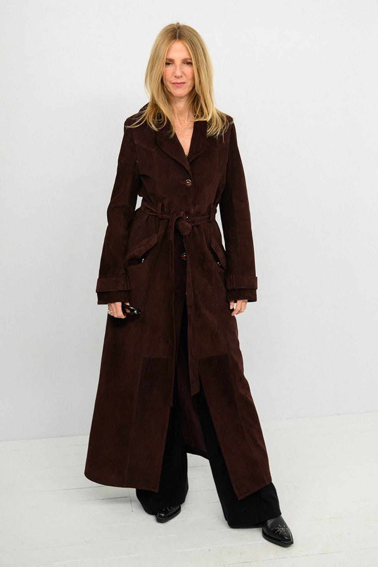 Sandrine Kiberlain en trench en daim marron et santiags au défilé Givenchy