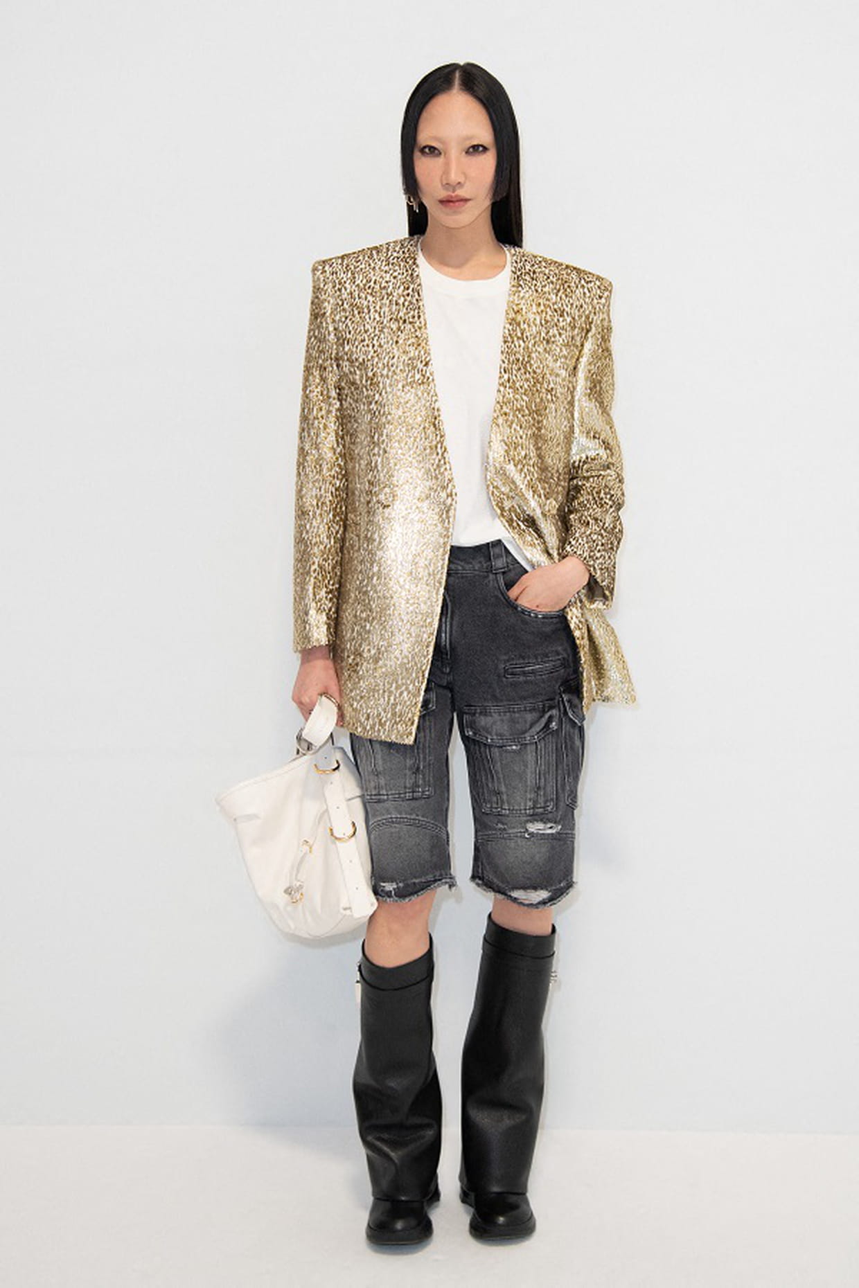 Soo Joo Park en T-shirt blanc et pantacourt délavé déchiré au défilé Givenchy