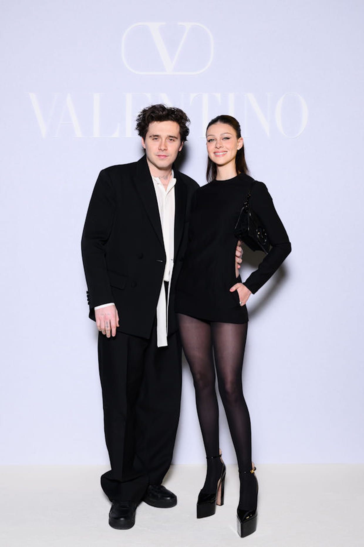 Brooklyn Beckham en pantalon large et chemise blanche et Nicola Peltz en combishort et sandales à plateformes au défilé Valentino pendant la Fashion week automne-hiver 2023-2024 à Paris le 5 mars 2023.