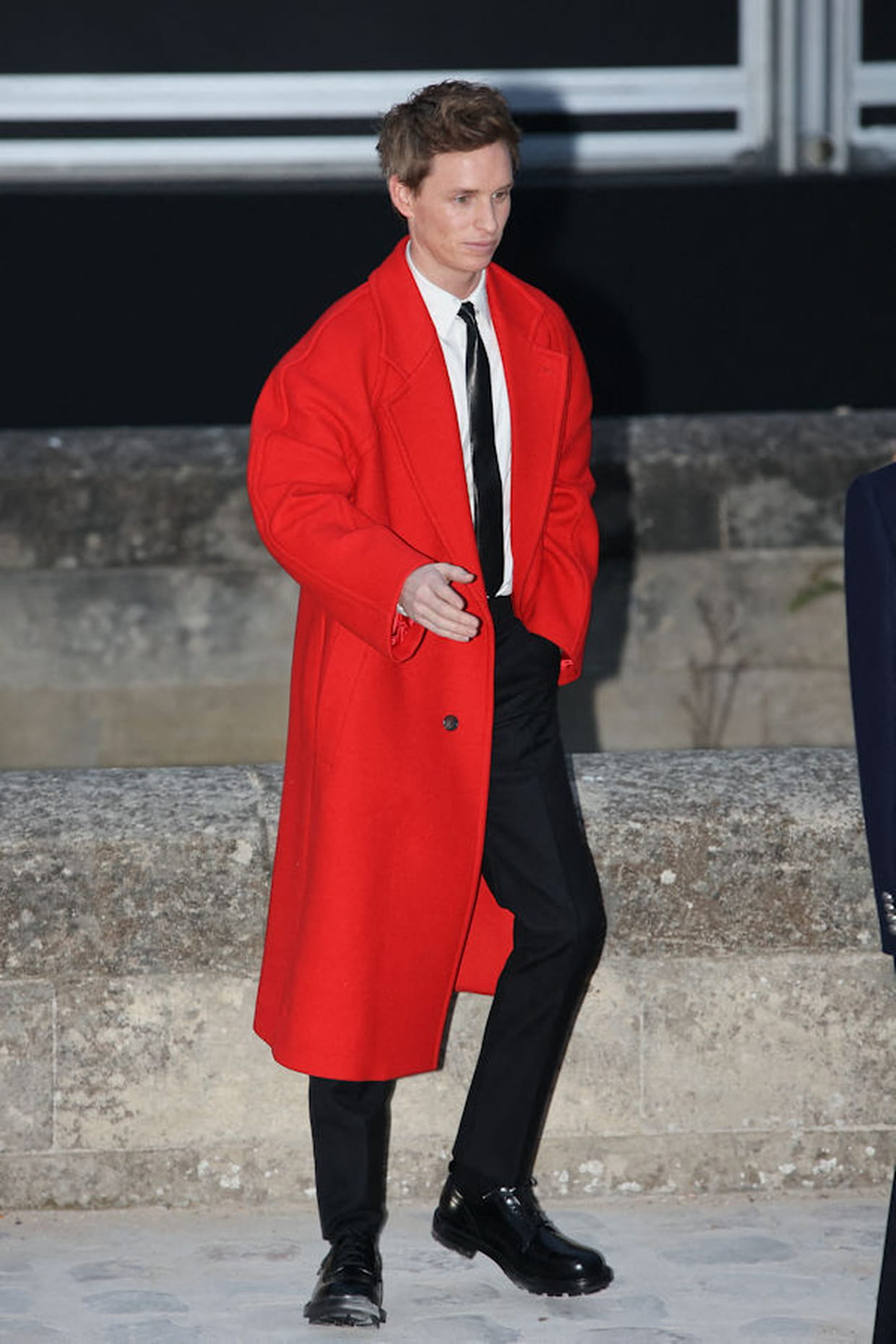 Eddie Redmayne en long manteau rouge et cravate en cuir au défilé Alexander McQueen